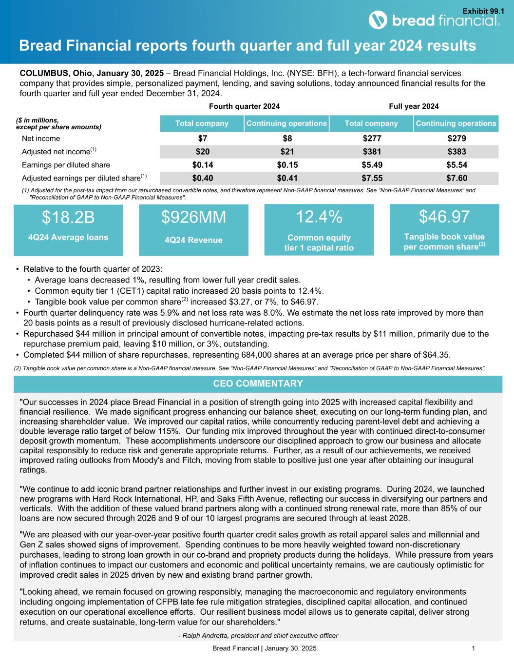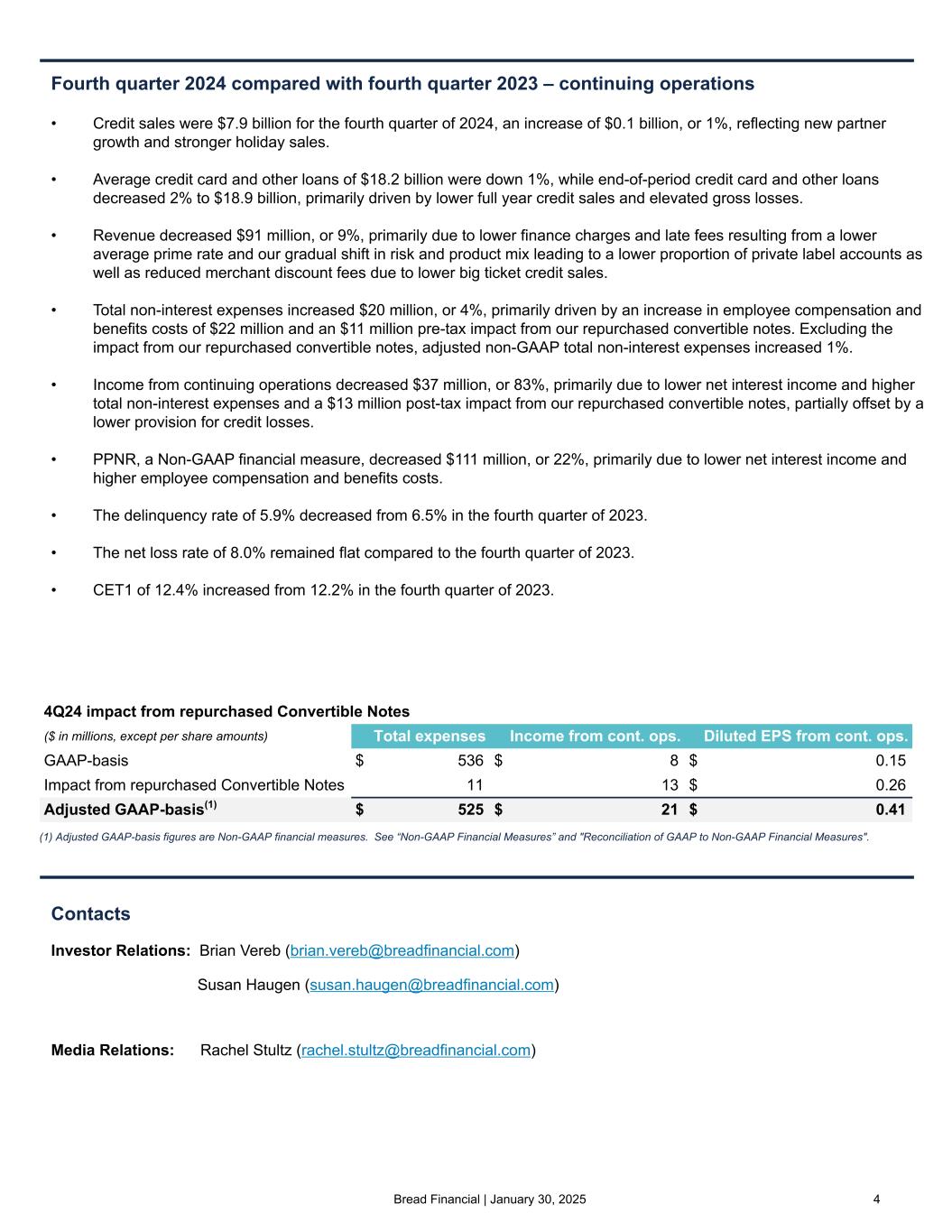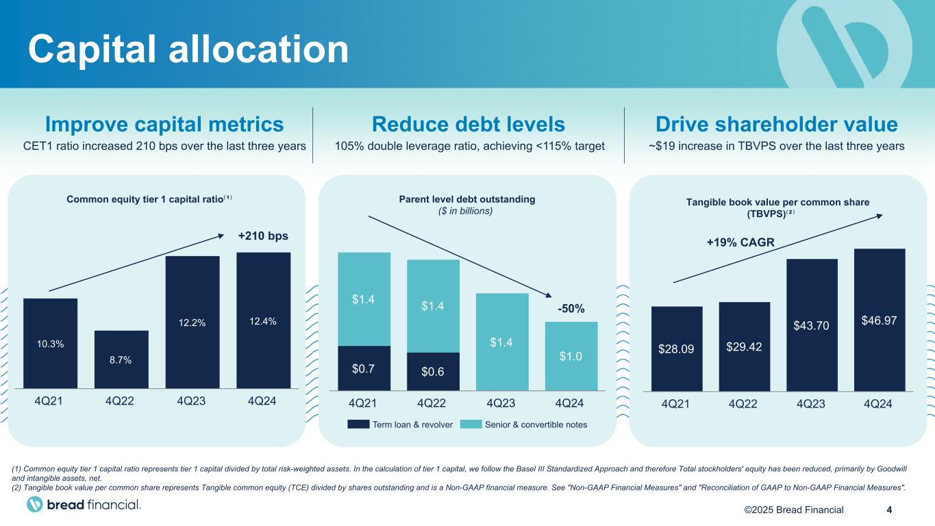 3©2025 Bread Financial Key highlights Fourth quarter 2024 (1) Adjusted income from continuing operations, Adjusted diluted EPS from continuing operations, and Tangible book value per common share are Non-GAAP financial measures. See “Non-GAAP Financial Measures” and "Reconciliation of GAAP to Non-GAAP Financial Measures". Demonstrated financial resilience and opportunistic capital allocation • Repurchased $44 million in principal amount of our convertible notes, leaving $10 million outstanding • Net income of $7 million and earnings per diluted share of $0.14 ◦ Adjusted income from continuing operations(1) of $21 million and adjusted diluted EPS from continuing operations(1) of $0.41 exclude the $13 million post-tax impact from the premium paid on our repurchased convertible notes • Tangible book value per common share(1) of $46.97 increased 7% year-over-year • Common equity tier 1 (CET1) capital ratio of 12.4% increased 20 bps year-over-year • Direct-to-consumer deposits of $7.7 billion increased 19% year-over-year, and now represent 43% of our average total funding • Completed $44 million of share repurchases, representing 684,000 shares at an average price per share of $64.35 Proactive risk management with gradual economic improvement • Continued to see signs of stabilization in consumer health with increased spending from millennials and Gen Z throughout the holiday season, as well as improved credit metrics influenced by proactive credit tightening actions • Ongoing implementation of mitigation plans to limit the financial impact of the CFPB late fee rule with various pricing changes in-market, including increased APRs and statement fees