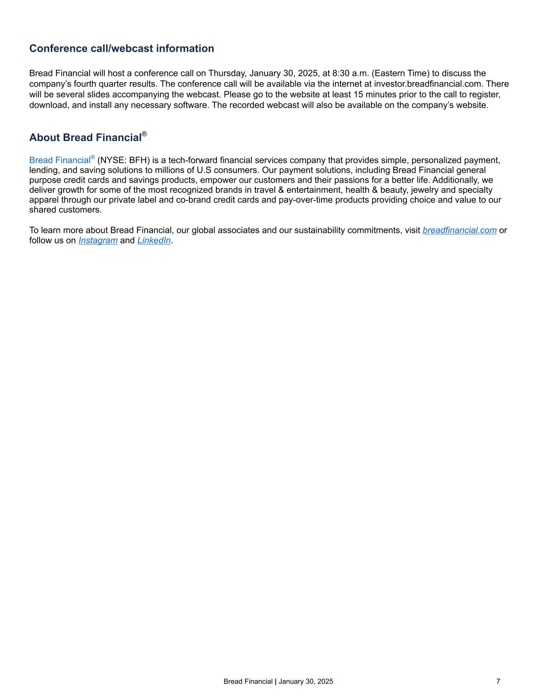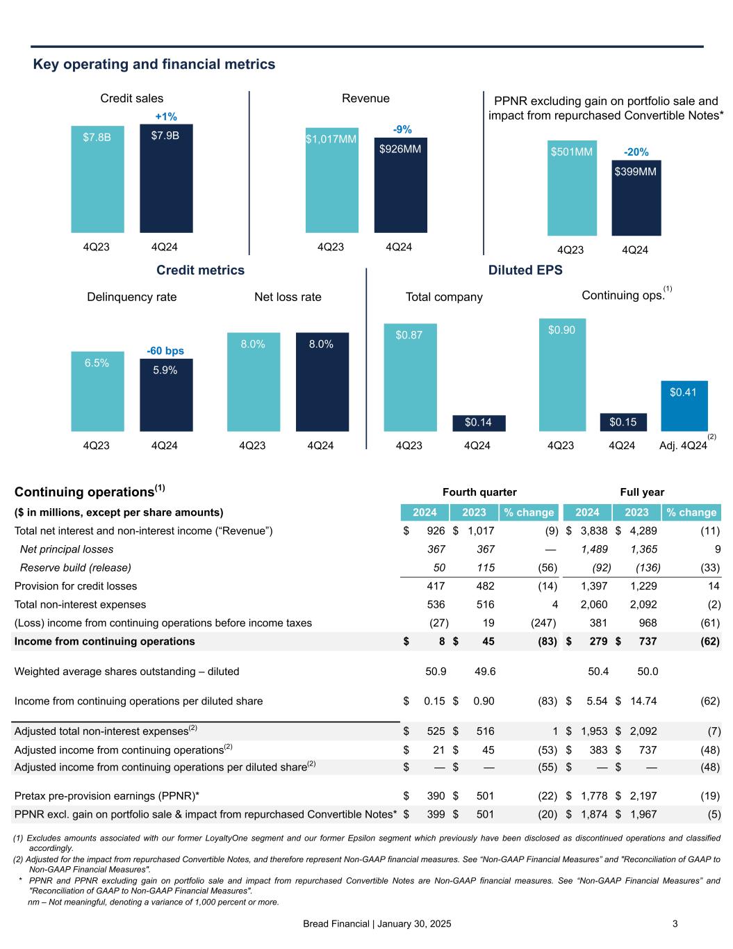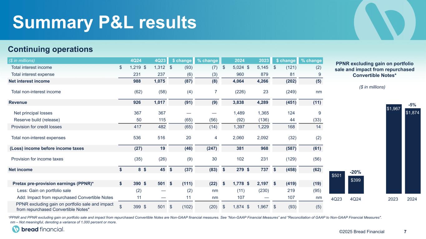6©2025 Bread Financial $0.9 billion (1) Continuing operations excludes amounts associated with our former LoyaltyOne segment and our former Epsilon segment which previously have been disclosed as discontinued operations and classified accordingly. As well, beginning in 2024, we revised the calculation of average balances to more closely align with industry practice by incorporating an average daily balance. Prior to 2024, average balances represent the average balance at the beginning and end of each month, averaged over the periods indicated. (2) Adjusted GAAP-basis figures are Non-GAAP financial measures. See “Non-GAAP Financial Measures” and "Reconciliation of GAAP to Non-GAAP Financial Measures". Continuing operations(1) Revenue 4Q24 impact from repurchased Convertible Notes ($ in millions, except per share amounts) Total expenses Income from cont. ops. Diluted EPS from cont. ops. GAAP-basis $ 536 $ 8 $ 0.15 Impact from repurchased Convertible Notes 11 13 0.26 Adjusted GAAP-basis(2) $ 525 $ 21 $ 0.41 Year-over-year comparisons • Credit sales of $7.9 billion increased 1%, primarily reflecting new partner growth and stronger holiday sales. • Average loans of $18.2 billion decreased 1%, primarily driven by lower full year credit sales and elevated gross losses. • Revenue decreased $91 million, or 9%, primarily due to lower finance charges and late fees resulting from a lower average prime rate and our gradual shift in risk and product mix leading to a lower proportion of private label accounts as well as reduced merchant discount fees due to lower big ticket credit sales. • Total non-interest expenses increased $20 million, or 4%, primarily driven by an increase in employee compensation and benefits costs of $22 million and an $11 million pre-tax impact from our repurchased convertible notes. Excluding the impact from our repurchased convertible notes, adjusted non-GAAP total non-interest expenses(2) increased 1%. • Income from continuing operations decreased $37 million, or 83%, primarily due to lower net interest income and higher total non-interest expenses and a $13 million post-tax impact from our repurchased convertible notes, partially offset by a lower provision for credit losses. • The delinquency rate of 5.9% decreased from 6.5% in the fourth quarter of 2023. • The net loss rate of 8.0% remained flat to the fourth quarter of 2023.Diluted EPS Adj. diluted EPS(2) Net income Adj. net income(2) $8 million $21 million $0.41$0.15 Fourth quarter 2024 financial highlights