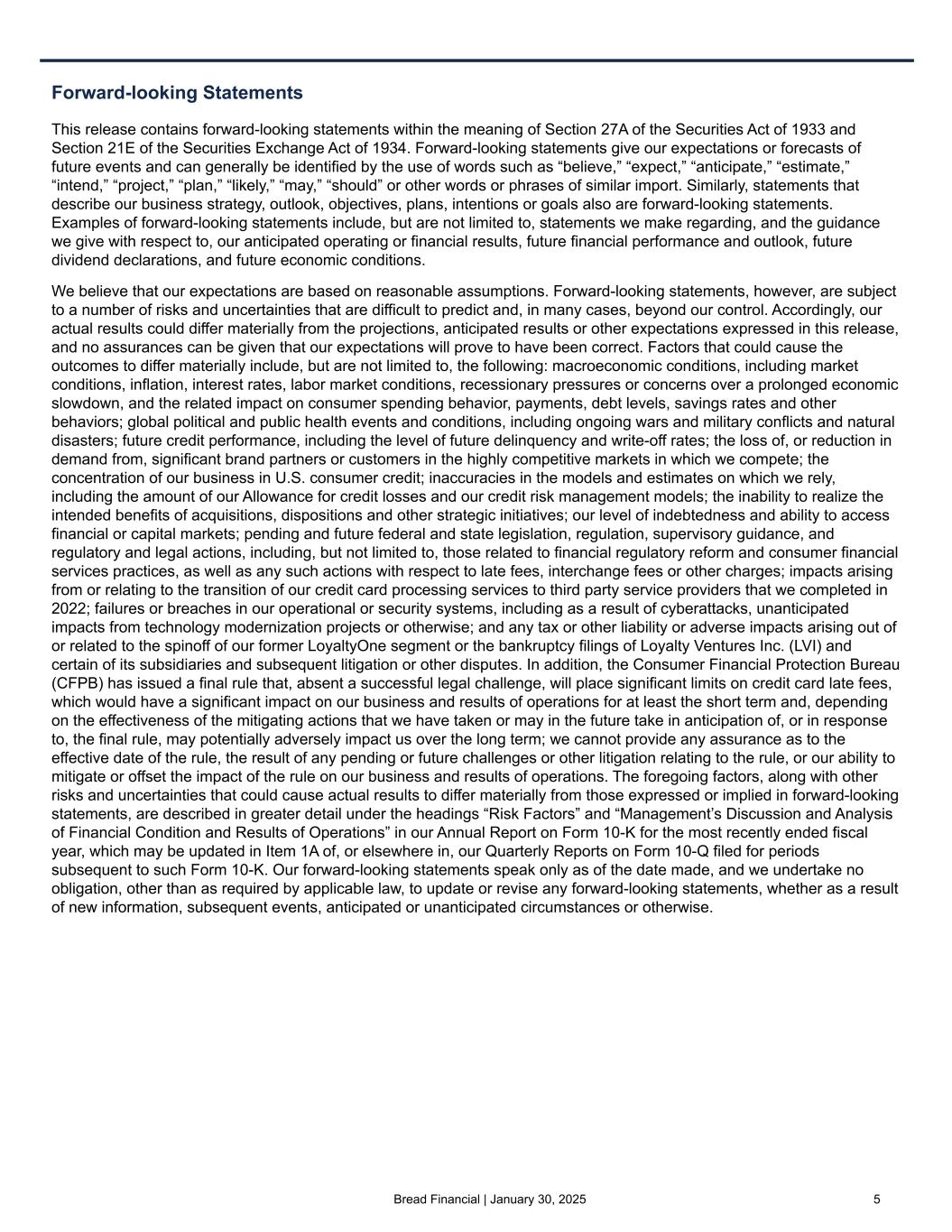 23©2025 Bread Financial Forward-looking statements This release contains forward-looking statements within the meaning of Section 27A of the Securities Act of 1933 and Section 21E of the Securities Exchange Act of 1934. Forward-looking statements give our expectations or forecasts of future events and can generally be identified by the use of words such as “believe,” “expect,” “anticipate,” “estimate,” “intend,” “project,” “plan,” “likely,” “may,” “should” or other words or phrases of similar import. Similarly, statements that describe our business strategy, outlook, objectives, plans, intentions or goals also are forward-looking statements. Examples of forward-looking statements include, but are not limited to, statements we make regarding, and the guidance we give with respect to, our anticipated operating or financial results, future financial performance and outlook, future dividend declarations, and future economic conditions. We believe that our expectations are based on reasonable assumptions. Forward-looking statements, however, are subject to a number of risks and uncertainties that are difficult to predict and, in many cases, beyond our control. Accordingly, our actual results could differ materially from the projections, anticipated results or other expectations expressed in this release, and no assurances can be given that our expectations will prove to have been correct. Factors that could cause the outcomes to differ materially include, but are not limited to, the following: macroeconomic conditions, including market conditions, inflation, interest rates, labor market conditions, recessionary pressures or concerns over a prolonged economic slowdown, and the related impact on consumer spending behavior, payments, debt levels, savings rates and other behaviors; global political and public health events and conditions, including ongoing wars and military conflicts and natural disasters; future credit performance, including the level of future delinquency and write-off rates; the loss of, or reduction in demand from, significant brand partners or customers in the highly competitive markets in which we compete; the concentration of our business in U.S. consumer credit; inaccuracies in the models and estimates on which we rely, including the amount of our Allowance for credit losses and our credit risk management models; the inability to realize the intended benefits of acquisitions, dispositions and other strategic initiatives; our level of indebtedness and ability to access financial or capital markets; pending and future federal and state legislation, regulation, supervisory guidance, and regulatory and legal actions, including, but not limited to, those related to financial regulatory reform and consumer financial services practices, as well as any such actions with respect to late fees, interchange fees or other charges; impacts arising from or relating to the transition of our credit card processing services to third party service providers that we completed in 2022; failures or breaches in our operational or security systems, including as a result of cyberattacks, unanticipated impacts from technology modernization projects or otherwise; and any tax or other liability or adverse impacts arising out of or related to the spinoff of our former LoyaltyOne segment or the bankruptcy filings of Loyalty Ventures Inc. (LVI) and certain of its subsidiaries and subsequent litigation or other disputes. In addition, the Consumer Financial Protection Bureau (CFPB) has issued a final rule that, absent a successful legal challenge, will place significant limits on credit card late fees, which would have a significant impact on our business and results of operations for at least the short term and, depending on the effectiveness of the mitigating actions that we have taken or may in the future take in anticipation of, or in response to, the final rule, may potentially adversely impact us over the long term; we cannot provide any assurance as to the effective date of the rule, the result of any pending or future challenges or other litigation relating to the rule, or our ability to mitigate or offset the impact of the rule on our business and results of operations. The foregoing factors, along with other risks and uncertainties that could cause actual results to differ materially from those expressed or implied in forward-looking statements, are described in greater detail under the headings “Risk Factors” and “Management’s Discussion and Analysis of Financial Condition and Results of Operations” in our Annual Report on Form 10-K for the most recently ended fiscal year, which may be updated in Item 1A of, or elsewhere in, our Quarterly Reports on Form 10-Q filed for periods subsequent to such Form 10-K. Our forward-looking statements speak only as of the date made, and we undertake no obligation, other than as required by applicable law, to update or revise any forward-looking statements, whether as a result of new information, subsequent events, anticipated or unanticipated circumstances or otherwise.