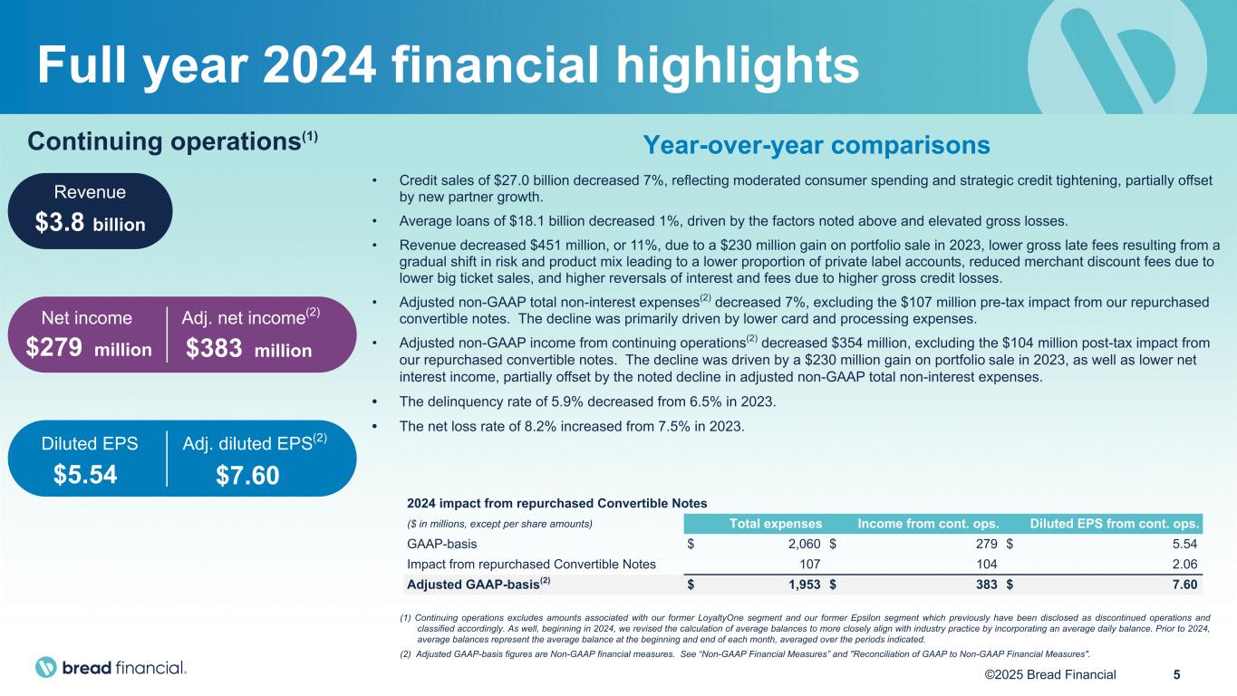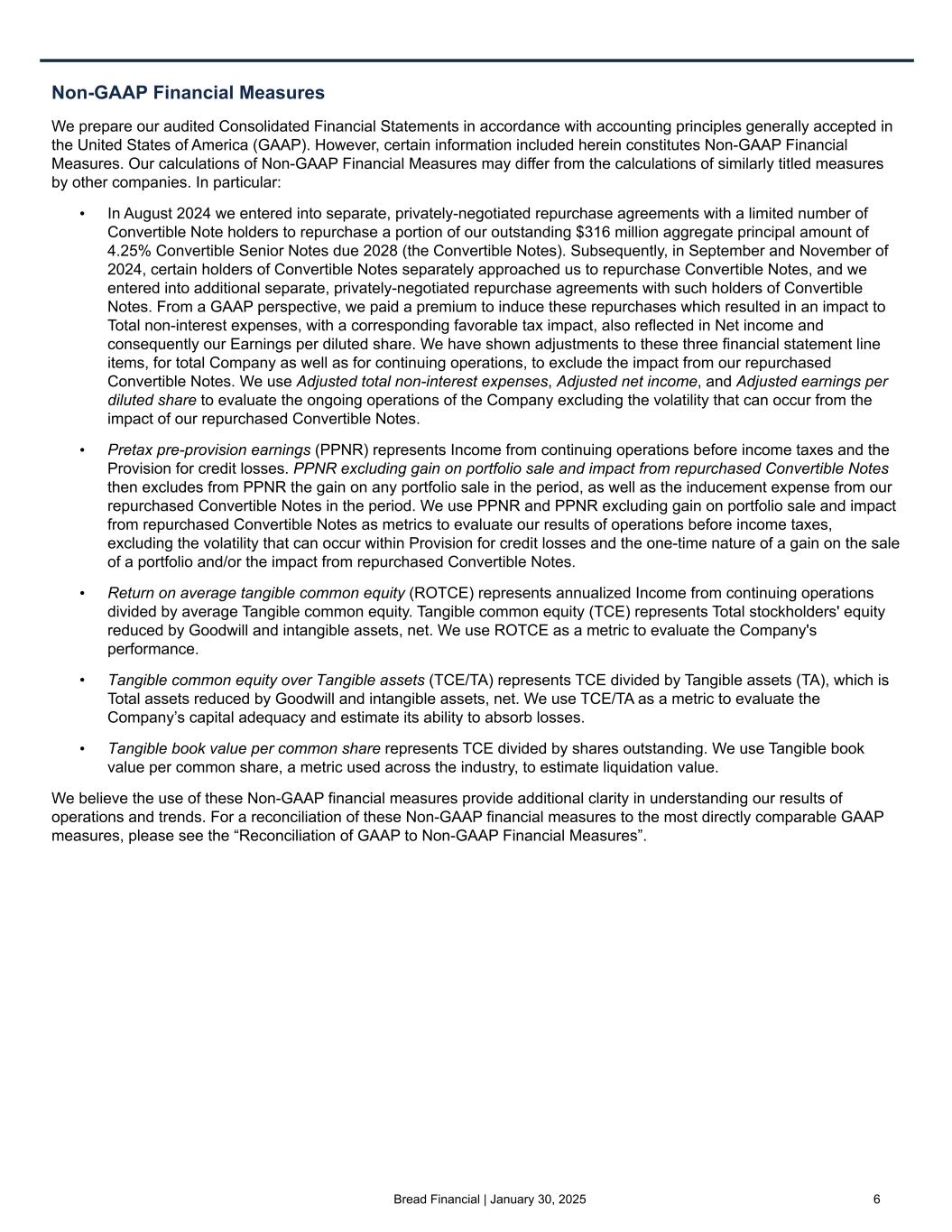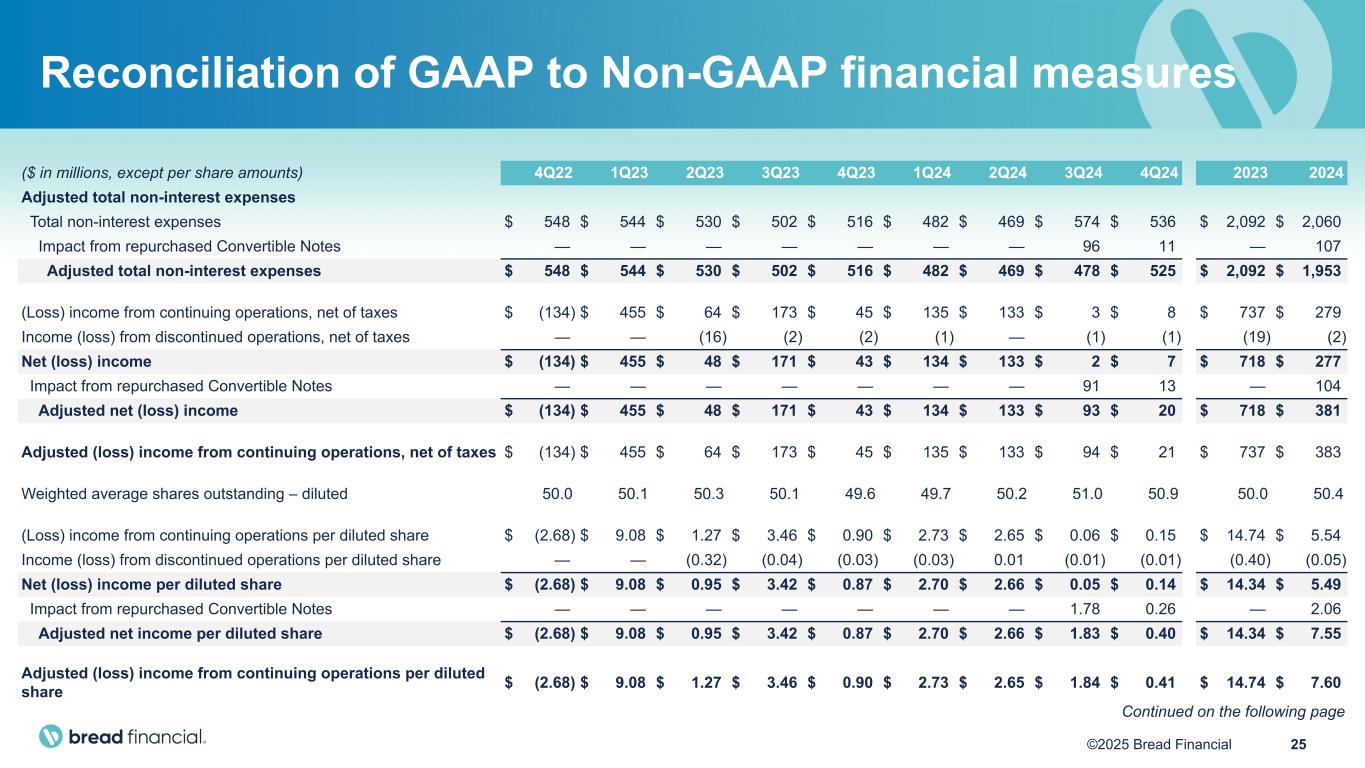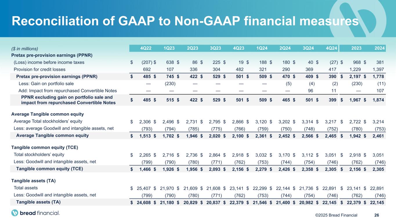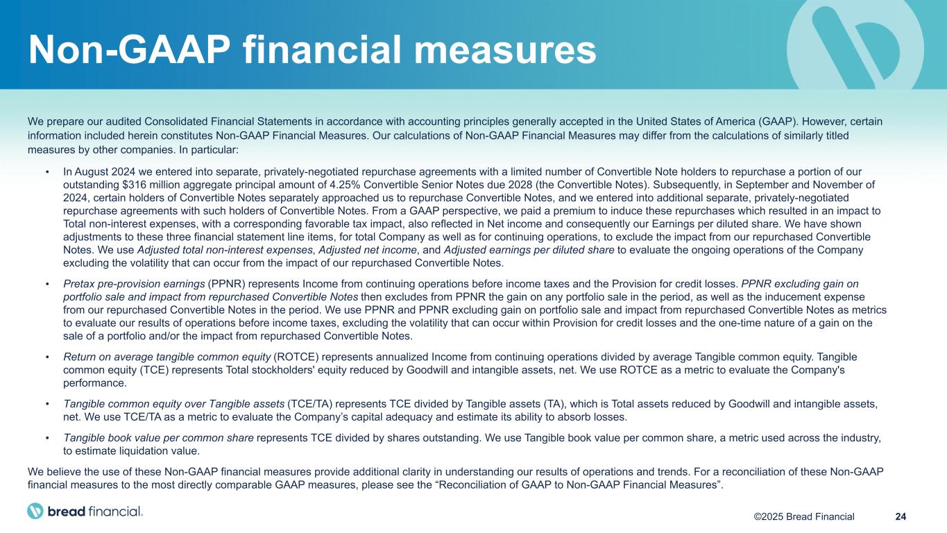 24©2025 Bread Financial We prepare our audited Consolidated Financial Statements in accordance with accounting principles generally accepted in the United States of America (GAAP). However, certain information included herein constitutes Non-GAAP Financial Measures. Our calculations of Non-GAAP Financial Measures may differ from the calculations of similarly titled measures by other companies. In particular: • In August 2024 we entered into separate, privately-negotiated repurchase agreements with a limited number of Convertible Note holders to repurchase a portion of our outstanding $316 million aggregate principal amount of 4.25% Convertible Senior Notes due 2028 (the Convertible Notes). Subsequently, in September and November of 2024, certain holders of Convertible Notes separately approached us to repurchase Convertible Notes, and we entered into additional separate, privately-negotiated repurchase agreements with such holders of Convertible Notes. From a GAAP perspective, we paid a premium to induce these repurchases which resulted in an impact to Total non-interest expenses, with a corresponding favorable tax impact, also reflected in Net income and consequently our Earnings per diluted share. We have shown adjustments to these three financial statement line items, for total Company as well as for continuing operations, to exclude the impact from our repurchased Convertible Notes. We use Adjusted total non-interest expenses, Adjusted net income, and Adjusted earnings per diluted share to evaluate the ongoing operations of the Company excluding the volatility that can occur from the impact of our repurchased Convertible Notes. • Pretax pre-provision earnings (PPNR) represents Income from continuing operations before income taxes and the Provision for credit losses. PPNR excluding gain on portfolio sale and impact from repurchased Convertible Notes then excludes from PPNR the gain on any portfolio sale in the period, as well as the inducement expense from our repurchased Convertible Notes in the period. We use PPNR and PPNR excluding gain on portfolio sale and impact from repurchased Convertible Notes as metrics to evaluate our results of operations before income taxes, excluding the volatility that can occur within Provision for credit losses and the one-time nature of a gain on the sale of a portfolio and/or the impact from repurchased Convertible Notes. • Return on average tangible common equity (ROTCE) represents annualized Income from continuing operations divided by average Tangible common equity. Tangible common equity (TCE) represents Total stockholders' equity reduced by Goodwill and intangible assets, net. We use ROTCE as a metric to evaluate the Company's performance. • Tangible common equity over Tangible assets (TCE/TA) represents TCE divided by Tangible assets (TA), which is Total assets reduced by Goodwill and intangible assets, net. We use TCE/TA as a metric to evaluate the Company’s capital adequacy and estimate its ability to absorb losses. • Tangible book value per common share represents TCE divided by shares outstanding. We use Tangible book value per common share, a metric used across the industry, to estimate liquidation value. We believe the use of these Non-GAAP financial measures provide additional clarity in understanding our results of operations and trends. For a reconciliation of these Non-GAAP financial measures to the most directly comparable GAAP measures, please see the “Reconciliation of GAAP to Non-GAAP Financial Measures”. Non-GAAP financial measures