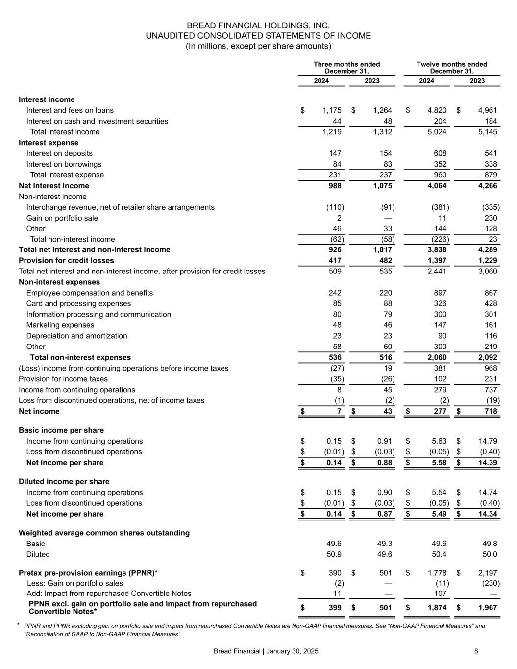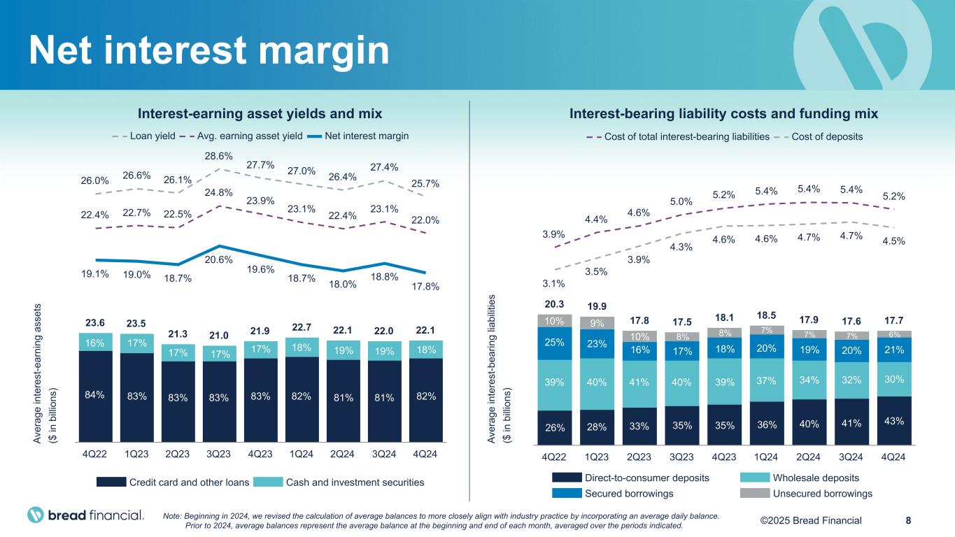 7©2025 Bread Financial ($ in millions) 4Q24 4Q23 $ change % change 2024 2023 $ change % change Total interest income $ 1,219 $ 1,312 $ (93) (7) $ 5,024 $ 5,145 $ (121) (2) Total interest expense 231 237 (6) (3) 960 879 81 9 Net interest income 988 1,075 (87) (8) 4,064 4,266 (202) (5) Total non-interest income (62) (58) (4) 7 (226) 23 (249) nm Revenue 926 1,017 (91) (9) 3,838 4,289 (451) (11) Net principal losses 367 367 — — 1,489 1,365 124 9 Reserve build (release) 50 115 (65) (56) (92) (136) 44 (33) Provision for credit losses 417 482 (65) (14) 1,397 1,229 168 14 Total non-interest expenses 536 516 20 4 2,060 2,092 (32) (2) (Loss) income before income taxes (27) 19 (46) (247) 381 968 (587) (61) Provision for income taxes (35) (26) (9) 30 102 231 (129) (56) Net income $ 8 $ 45 $ (37) (83) $ 279 $ 737 $ (458) (62) Pretax pre-provision earnings (PPNR)* $ 390 $ 501 $ (111) (22) $ 1,778 $ 2,197 $ (419) (19) Less: Gain on portfolio sale (2) — (2) nm (11) (230) 219 (95) Add: Impact from repurchased Convertible Notes 11 — 11 nm 107 — 107 nm PPNR excluding gain on portfolio sale and impact from repurchased Convertible Notes* $ 399 $ 501 $ (102) (20) $ 1,874 $ 1,967 $ (93) (5) PPNR excluding gain on portfolio sale and impact from repurchased Convertible Notes* $501 $399 $1,967 $1,874 4Q23 4Q24 2023 2024 *PPNR and PPNR excluding gain on portfolio sale and impact from repurchased Convertible Notes are Non-GAAP financial measures. See “Non-GAAP Financial Measures” and "Reconciliation of GAAP to Non-GAAP Financial Measures". nm – Not meaningful, denoting a variance of 1,000 percent or more. -5% -20% ($ in millions) Summary P&L results Continuing operations