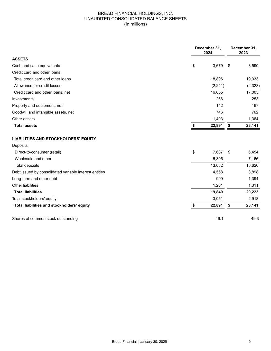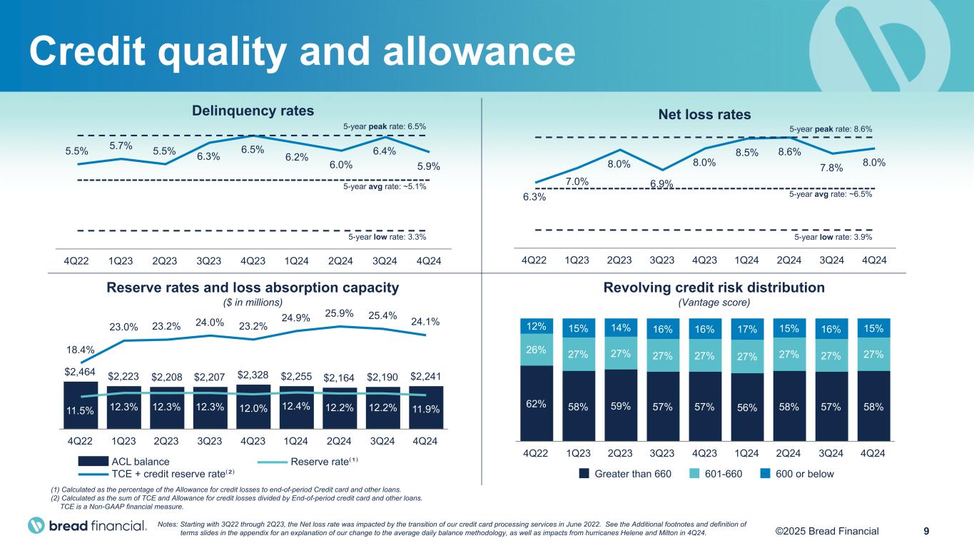 8©2025 Bread Financial 20.3 19.9 17.8 17.5 18.1 18.5 17.9 17.6 17.7 Direct-to-consumer deposits Wholesale deposits Secured borrowings Unsecured borrowings 4Q22 1Q23 2Q23 3Q23 4Q23 1Q24 2Q24 3Q24 4Q24 23.6 23.5 21.3 21.0 21.9 22.7 22.1 22.0 22.1 Credit card and other loans Cash and investment securities 4Q22 1Q23 2Q23 3Q23 4Q23 1Q24 2Q24 3Q24 4Q24 Av er ag e in te re st -b ea rin g lia bi lit ie s ($ in b ill io ns ) Av er ag e in te re st -e ar ni ng a ss et s ($ in b ill io ns ) Interest-earning asset yields and mix 26.0% 26.6% 26.1% 28.6% 27.7% 27.0% 26.4% 27.4% 25.7% 22.4% 22.7% 22.5% 24.8% 23.9% 23.1% 22.4% 23.1% 22.0% 19.1% 19.0% 18.7% 20.6% 19.6% 18.7% 18.0% 18.8% 17.8% Loan yield Avg. earning asset yield Net interest margin Interest-bearing liability costs and funding mix 3.9% 4.4% 4.6% 5.0% 5.2% 5.4% 5.4% 5.4% 5.2% 3.1% 3.5% 3.9% 4.3% 4.6% 4.6% 4.7% 4.7% 4.5% Cost of total interest-bearing liabilities Cost of deposits Net interest margin 84% 83% 83% 83% 83% 82% 81% 81% 82% 16% 17% 17% 17% 17% 18% 19% 19% 18% 25% 23% 16% 17% 18% 20% 19% 20% 21% 10% 9% 10% 8% 8% 7% 7% 7% 6% 26% 28% 33% 35% 35% 36% 40% 41% 43% 39% 40% 41% 40% 39% 37% 34% 32% 30% Note: Beginning in 2024, we revised the calculation of average balances to more closely align with industry practice by incorporating an average daily balance. Prior to 2024, average balances represent the average balance at the beginning and end of each month, averaged over the periods indicated.