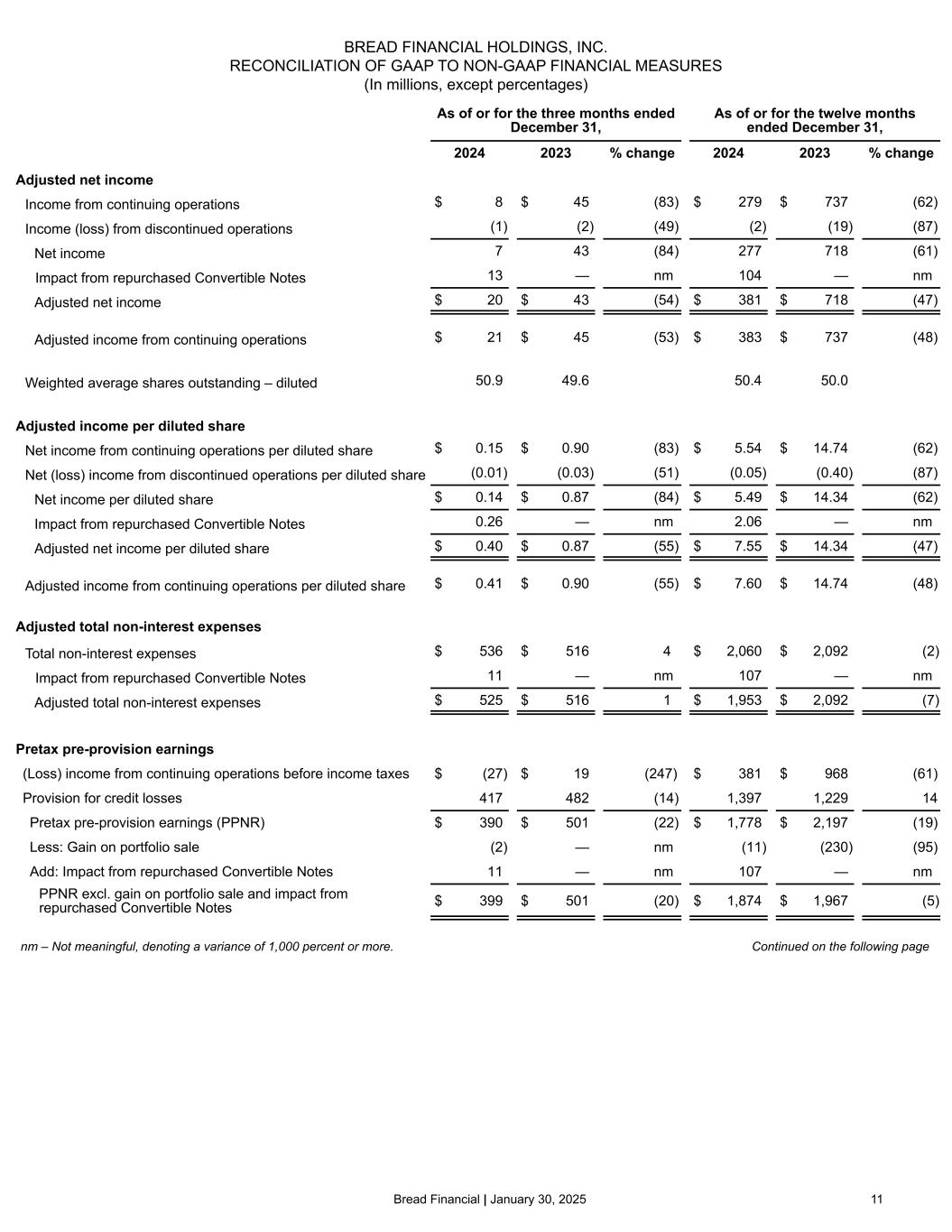 25©2025 Bread Financial Reconciliation of GAAP to Non-GAAP financial measures ($ in millions, except per share amounts) 4Q22 1Q23 2Q23 3Q23 4Q23 1Q24 2Q24 3Q24 4Q24 2023 2024 Adjusted total non-interest expenses Total non-interest expenses $ 548 $ 544 $ 530 $ 502 $ 516 $ 482 $ 469 $ 574 $ 536 $ 2,092 $ 2,060 Impact from repurchased Convertible Notes — — — — — — — 96 11 — 107 Adjusted total non-interest expenses $ 548 $ 544 $ 530 $ 502 $ 516 $ 482 $ 469 $ 478 $ 525 $ 2,092 $ 1,953 (Loss) income from continuing operations, net of taxes $ (134) $ 455 $ 64 $ 173 $ 45 $ 135 $ 133 $ 3 $ 8 $ 737 $ 279 Income (loss) from discontinued operations, net of taxes — — (16) (2) (2) (1) — (1) (1) (19) (2) Net (loss) income $ (134) $ 455 $ 48 $ 171 $ 43 $ 134 $ 133 $ 2 $ 7 $ 718 $ 277 Impact from repurchased Convertible Notes — — — — — — — 91 13 — 104 Adjusted net (loss) income $ (134) $ 455 $ 48 $ 171 $ 43 $ 134 $ 133 $ 93 $ 20 $ 718 $ 381 Adjusted (loss) income from continuing operations, net of taxes $ (134) $ 455 $ 64 $ 173 $ 45 $ 135 $ 133 $ 94 $ 21 $ 737 $ 383 Weighted average shares outstanding – diluted 50.0 50.1 50.3 50.1 49.6 49.7 50.2 51.0 50.9 50.0 50.4 (Loss) income from continuing operations per diluted share $ (2.68) $ 9.08 $ 1.27 $ 3.46 $ 0.90 $ 2.73 $ 2.65 $ 0.06 $ 0.15 $ 14.74 $ 5.54 Income (loss) from discontinued operations per diluted share — — (0.32) (0.04) (0.03) (0.03) 0.01 (0.01) (0.01) (0.40) (0.05) Net (loss) income per diluted share $ (2.68) $ 9.08 $ 0.95 $ 3.42 $ 0.87 $ 2.70 $ 2.66 $ 0.05 $ 0.14 $ 14.34 $ 5.49 Impact from repurchased Convertible Notes — — — — — — — 1.78 0.26 — 2.06 Adjusted net income per diluted share $ (2.68) $ 9.08 $ 0.95 $ 3.42 $ 0.87 $ 2.70 $ 2.66 $ 1.83 $ 0.40 $ 14.34 $ 7.55 Adjusted (loss) income from continuing operations per diluted share $ (2.68) $ 9.08 $ 1.27 $ 3.46 $ 0.90 $ 2.73 $ 2.65 $ 1.84 $ 0.41 $ 14.74 $ 7.60 Continued on the following page
