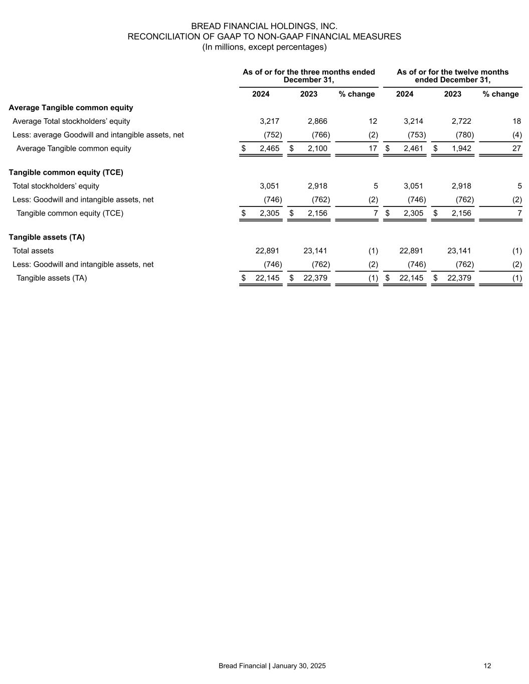 26©2025 Bread Financial ($ in millions) 4Q22 1Q23 2Q23 3Q23 4Q23 1Q24 2Q24 3Q24 4Q24 2023 2024 Pretax pre-provision earnings (PPNR) (Loss) income before income taxes $ (207) $ 638 $ 86 $ 225 $ 19 $ 188 $ 180 $ 40 $ (27) $ 968 $ 381 Provision for credit losses 692 107 336 304 482 321 290 369 417 1,229 1,397 Pretax pre-provision earnings (PPNR) $ 485 $ 745 $ 422 $ 529 $ 501 $ 509 $ 470 $ 409 $ 390 $ 2,197 $ 1,778 Less: Gain on portfolio sale — (230) — — — — (5) (4) (2) (230) (11) Add: Impact from repurchased Convertible Notes — — — — — — — 96 11 — 107 PPNR excluding gain on portfolio sale and impact from repurchased Convertible Notes $ 485 $ 515 $ 422 $ 529 $ 501 $ 509 $ 465 $ 501 $ 399 $ 1,967 $ 1,874 Average Tangible common equity Average Total stockholders’ equity $ 2,306 $ 2,496 $ 2,731 $ 2,795 $ 2,866 $ 3,120 $ 3,202 $ 3,314 $ 3,217 $ 2,722 $ 3,214 Less: average Goodwill and intangible assets, net (793) (794) (785) (775) (766) (759) (750) (748) (752) (780) (753) Average Tangible common equity $ 1,513 $ 1,702 $ 1,946 $ 2,020 $ 2,100 $ 2,361 $ 2,452 $ 2,566 $ 2,465 $ 1,942 $ 2,461 Tangible common equity (TCE) Total stockholders’ equity $ 2,265 $ 2,716 $ 2,736 $ 2,864 $ 2,918 $ 3,032 $ 3,170 $ 3,112 $ 3,051 $ 2,918 $ 3,051 Less: Goodwill and intangible assets, net (799) (790) (780) (771) (762) (753) (744) (754) (746) (762) (746) Tangible common equity (TCE) $ 1,466 $ 1,926 $ 1,956 $ 2,093 $ 2,156 $ 2,279 $ 2,426 $ 2,358 $ 2,305 $ 2,156 $ 2,305 Tangible assets (TA) Total assets $ 25,407 $ 21,970 $ 21,609 $ 21,608 $ 23,141 $ 22,299 $ 22,144 $ 21,736 $ 22,891 $ 23,141 $ 22,891 Less: Goodwill and intangible assets, net (799) (790) (780) (771) (762) (753) (744) (754) (746) (762) (746) Tangible assets (TA) $ 24,608 $ 21,180 $ 20,829 $ 20,837 $ 22,379 $ 21,546 $ 21,400 $ 20,982 $ 22,145 $ 22,379 $ 22,145 Reconciliation of GAAP to Non-GAAP financial measures