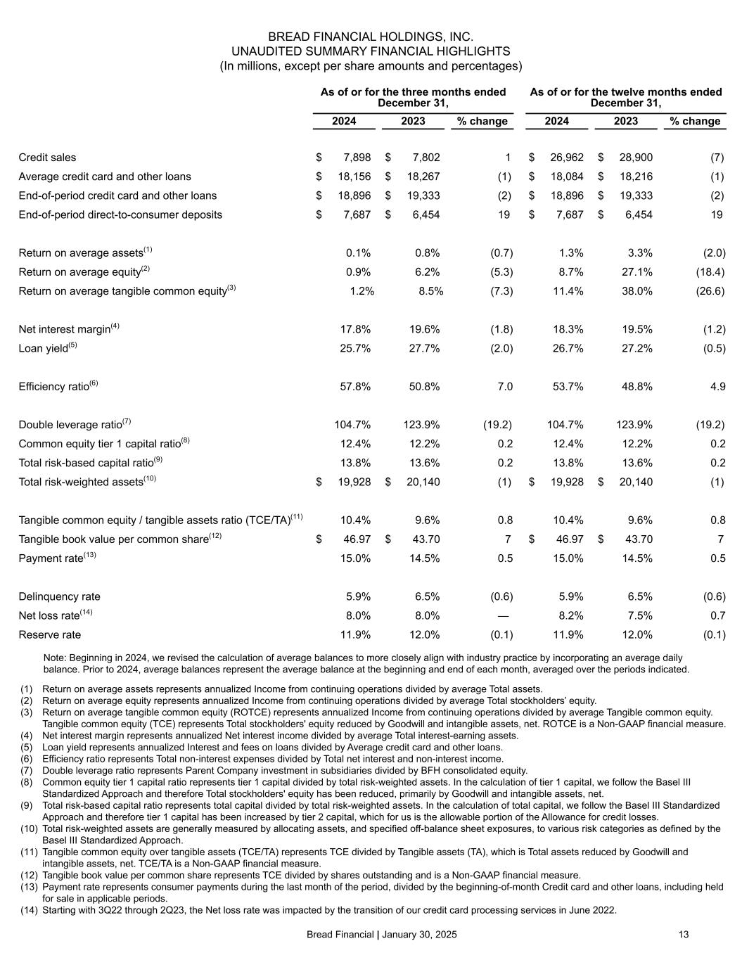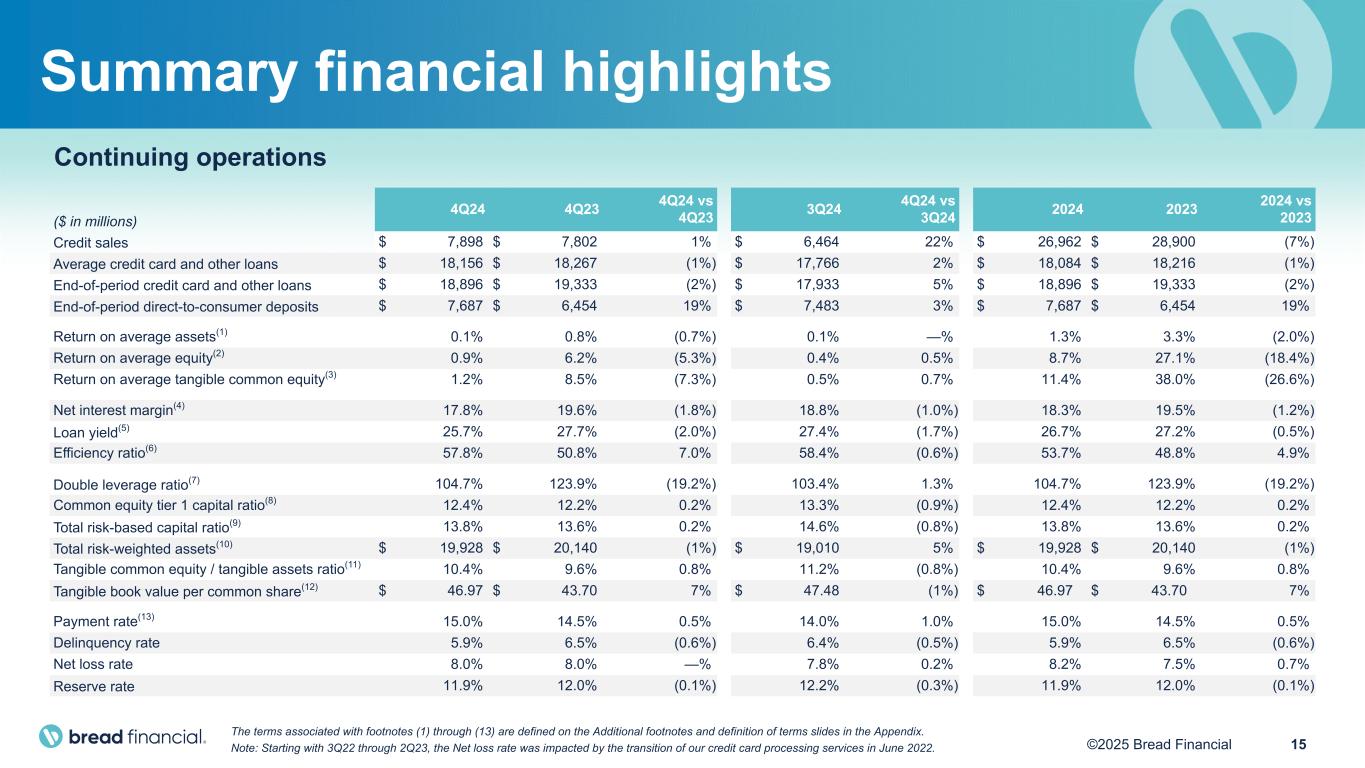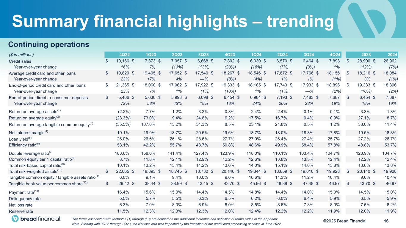 15©2025 Bread Financial Continuing operations ($ in millions) 4Q24 4Q23 4Q24 vs 4Q23 3Q24 4Q24 vs 3Q24 2024 2023 2024 vs 2023 Credit sales $ 7,898 $ 7,802 1% $ 6,464 22% $ 26,962 $ 28,900 (7%) Average credit card and other loans $ 18,156 $ 18,267 (1%) $ 17,766 2% $ 18,084 $ 18,216 (1%) End-of-period credit card and other loans $ 18,896 $ 19,333 (2%) $ 17,933 5% $ 18,896 $ 19,333 (2%) End-of-period direct-to-consumer deposits $ 7,687 $ 6,454 19% $ 7,483 3% $ 7,687 $ 6,454 19% Return on average assets(1) 0.1% 0.8% (0.7%) 0.1% —% 1.3% 3.3% (2.0%) Return on average equity(2) 0.9% 6.2% (5.3%) 0.4% 0.5% 8.7% 27.1% (18.4%) Return on average tangible common equity(3) 1.2% 8.5% (7.3%) 0.5% 0.7% 11.4% 38.0% (26.6%) Net interest margin(4) 17.8% 19.6% (1.8%) 18.8% (1.0%) 18.3% 19.5% (1.2%) Loan yield(5) 25.7% 27.7% (2.0%) 27.4% (1.7%) 26.7% 27.2% (0.5%) Efficiency ratio(6) 57.8% 50.8% 7.0% 58.4% (0.6%) 53.7% 48.8% 4.9% Double leverage ratio(7) 104.7% 123.9% (19.2%) 103.4% 1.3% 104.7% 123.9% (19.2%) Common equity tier 1 capital ratio(8) 12.4% 12.2% 0.2% 13.3% (0.9%) 12.4% 12.2% 0.2% Total risk-based capital ratio(9) 13.8% 13.6% 0.2% 14.6% (0.8%) 13.8% 13.6% 0.2% Total risk-weighted assets(10) $ 19,928 $ 20,140 (1%) $ 19,010 5% $ 19,928 $ 20,140 (1%) Tangible common equity / tangible assets ratio(11) 10.4% 9.6% 0.8% 11.2% (0.8%) 10.4% 9.6% 0.8% Tangible book value per common share(12) $ 46.97 $ 43.70 7% $ 47.48 (1%) $ 46.97 $ 43.70 7% Payment rate(13) 15.0% 14.5% 0.5% 14.0% 1.0% 15.0% 14.5% 0.5% Delinquency rate 5.9% 6.5% (0.6%) 6.4% (0.5%) 5.9% 6.5% (0.6%) Net loss rate 8.0% 8.0% —% 7.8% 0.2% 8.2% 7.5% 0.7% Reserve rate 11.9% 12.0% (0.1%) 12.2% (0.3%) 11.9% 12.0% (0.1%) The terms associated with footnotes (1) through (13) are defined on the Additional footnotes and definition of terms slides in the Appendix. Note: Starting with 3Q22 through 2Q23, the Net loss rate was impacted by the transition of our credit card processing services in June 2022. Summary financial highlights