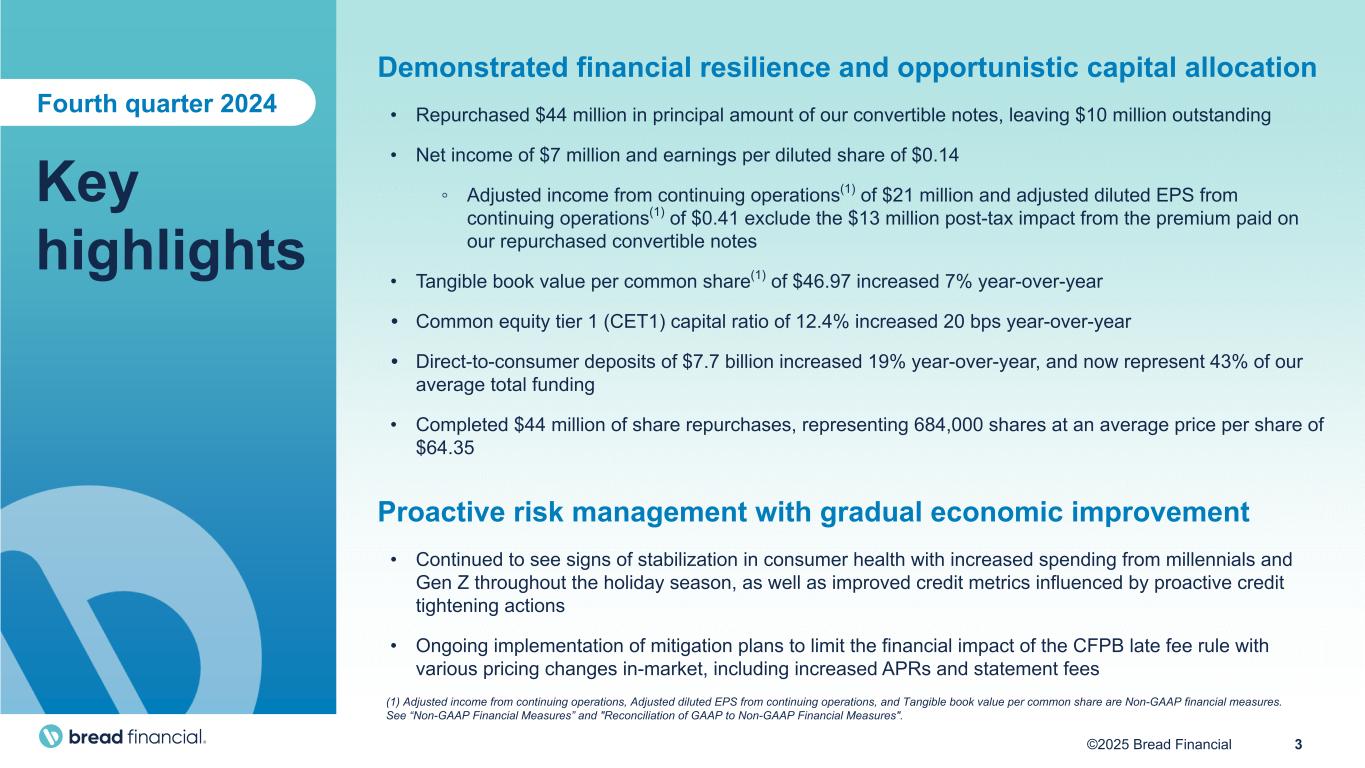 2©2025 Bread Financial 2024 achievements Full year 2024 outlook Full year 2024 actuals Average loans Down low single digits -1% Revenue (excl. gain on sale)(1) Down low to mid- single digits -6% Adjusted total non-interest expenses(1) Down mid-single digits -7% Net loss rate Low 8% range 8.2% Achieved full year 2024 financial targets (1) In the calculation of Full year 2024 actuals, Revenue (excl. gain on sale) excludes from Total revenue $11 million and $230 million in gains on portfolio sales for the years ended December 31, 2024 and 2023, respectively. Adjusted total non-interest expenses is a Non-GAAP Financial Measure. See “Non-GAAP Financial Measures” and "Reconciliation of GAAP to Non-GAAP Financial Measures". Delivered responsible growth • Launched new programs with Hard Rock International, HP, and Saks Fifth Avenue • 9 out of 10 largest programs are secured through at least 2028 • Maintained stable credit risk distribution despite a challenging macroeconomic environment • Balanced investment and risk through disciplined capital allocation Adapted to macroeconomic and regulatory environments • Effectively implemented our enhanced end-to-end credit management process to balance profitability and risk • Executed on mitigation strategies to limit the potential impact of the CFPB's rule on credit card late fees • Maintained conservative economic scenario weightings in our credit reserve modeling Strengthened our balance sheet • Achieved double leverage ratio target of below 115% • Improved CET1 by 20 basis points year-over-year to 12.4% • Grew tangible book value per share to $46.97 • Ratings outlook upgraded from stable to positive by Moody's and Fitch Drove operational excellence and technology advancement • Leveraged innovation, best practices, and scale to gain efficiencies throughout the organization • Advanced our technology platform anchored on customer centricity, resiliency, security, and growth