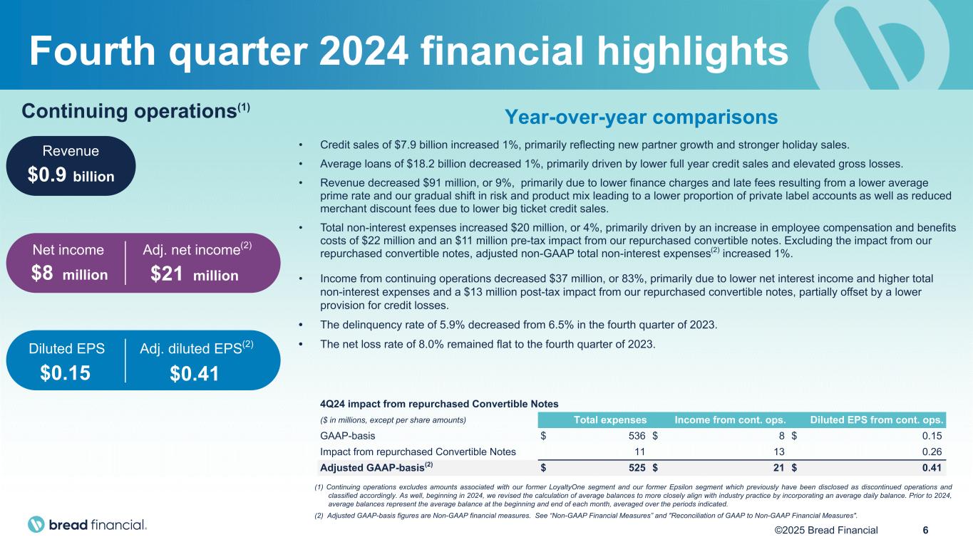 5©2025 Bread Financial $3.8 billion (1) Continuing operations excludes amounts associated with our former LoyaltyOne segment and our former Epsilon segment which previously have been disclosed as discontinued operations and classified accordingly. As well, beginning in 2024, we revised the calculation of average balances to more closely align with industry practice by incorporating an average daily balance. Prior to 2024, average balances represent the average balance at the beginning and end of each month, averaged over the periods indicated. (2) Adjusted GAAP-basis figures are Non-GAAP financial measures. See “Non-GAAP Financial Measures” and "Reconciliation of GAAP to Non-GAAP Financial Measures". Continuing operations(1) Revenue Year-over-year comparisons • Credit sales of $27.0 billion decreased 7%, reflecting moderated consumer spending and strategic credit tightening, partially offset by new partner growth. • Average loans of $18.1 billion decreased 1%, driven by the factors noted above and elevated gross losses. • Revenue decreased $451 million, or 11%, due to a $230 million gain on portfolio sale in 2023, lower gross late fees resulting from a gradual shift in risk and product mix leading to a lower proportion of private label accounts, reduced merchant discount fees due to lower big ticket sales, and higher reversals of interest and fees due to higher gross credit losses. • Adjusted non-GAAP total non-interest expenses(2) decreased 7%, excluding the $107 million pre-tax impact from our repurchased convertible notes. The decline was primarily driven by lower card and processing expenses. • Adjusted non-GAAP income from continuing operations(2) decreased $354 million, excluding the $104 million post-tax impact from our repurchased convertible notes. The decline was driven by a $230 million gain on portfolio sale in 2023, as well as lower net interest income, partially offset by the noted decline in adjusted non-GAAP total non-interest expenses. • The delinquency rate of 5.9% decreased from 6.5% in 2023. • The net loss rate of 8.2% increased from 7.5% in 2023. Diluted EPS Adj. diluted EPS(2) Net income Adj. net income(2) $279 million $383 million $7.60$5.54 Full year 2024 financial highlights 2024 impact from repurchased Convertible Notes ($ in millions, except per share amounts) Total expenses Income from cont. ops. Diluted EPS from cont. ops. GAAP-basis $ 2,060 $ 279 $ 5.54 Impact from repurchased Convertible Notes 107 104 2.06 Adjusted GAAP-basis(2) $ 1,953 $ 383 $ 7.60