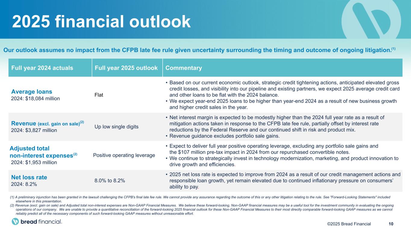 9©2025 Bread Financial $2,464 $2,223 $2,208 $2,207 $2,328 $2,255 $2,164 $2,190 $2,241 11.5% 12.3% 12.3% 12.3% 12.0% 12.4% 12.2% 12.2% 11.9% 18.4% 23.0% 23.2% 24.0% 23.2% 24.9% 25.9% 25.4% 24.1% ACL balance Reserve rate⁽¹⁾ TCE + credit reserve rate⁽²⁾ 4Q22 1Q23 2Q23 3Q23 4Q23 1Q24 2Q24 3Q24 4Q24 Net loss rates 6.3% 7.0% 8.0% 6.9% 8.0% 8.5% 8.6% 7.8% 8.0% 4Q22 1Q23 2Q23 3Q23 4Q23 1Q24 2Q24 3Q24 4Q24 Delinquency rates 5.5% 5.7% 5.5% 6.3% 6.5% 6.2% 6.0% 6.4% 5.9% 4Q22 1Q23 2Q23 3Q23 4Q23 1Q24 2Q24 3Q24 4Q24 5-year peak rate: 8.6% 5-year low rate: 3.9% 5-year avg rate: ~6.5% 5-year peak rate: 6.5% 5-year avg rate: ~5.1% 5-year low rate: 3.3% 62% 58% 59% 57% 57% 56% 58% 57% 58% 26% 27% 27% 27% 27% 27% 27% 27% 27% 12% 15% 14% 16% 16% 17% 15% 16% 15% Greater than 660 601-660 600 or below 4Q22 1Q23 2Q23 3Q23 4Q23 1Q24 2Q24 3Q24 4Q24 Reserve rates and loss absorption capacity ($ in millions) Revolving credit risk distribution (Vantage score) Credit quality and allowance (1) Calculated as the percentage of the Allowance for credit losses to end-of-period Credit card and other loans. (2) Calculated as the sum of TCE and Allowance for credit losses divided by End-of-period credit card and other loans. TCE is a Non-GAAP financial measure. Notes: Starting with 3Q22 through 2Q23, the Net loss rate was impacted by the transition of our credit card processing services in June 2022. See the Additional footnotes and definition of terms slides in the appendix for an explanation of our change to the average daily balance methodology, as well as impacts from hurricanes Helene and Milton in 4Q24.
