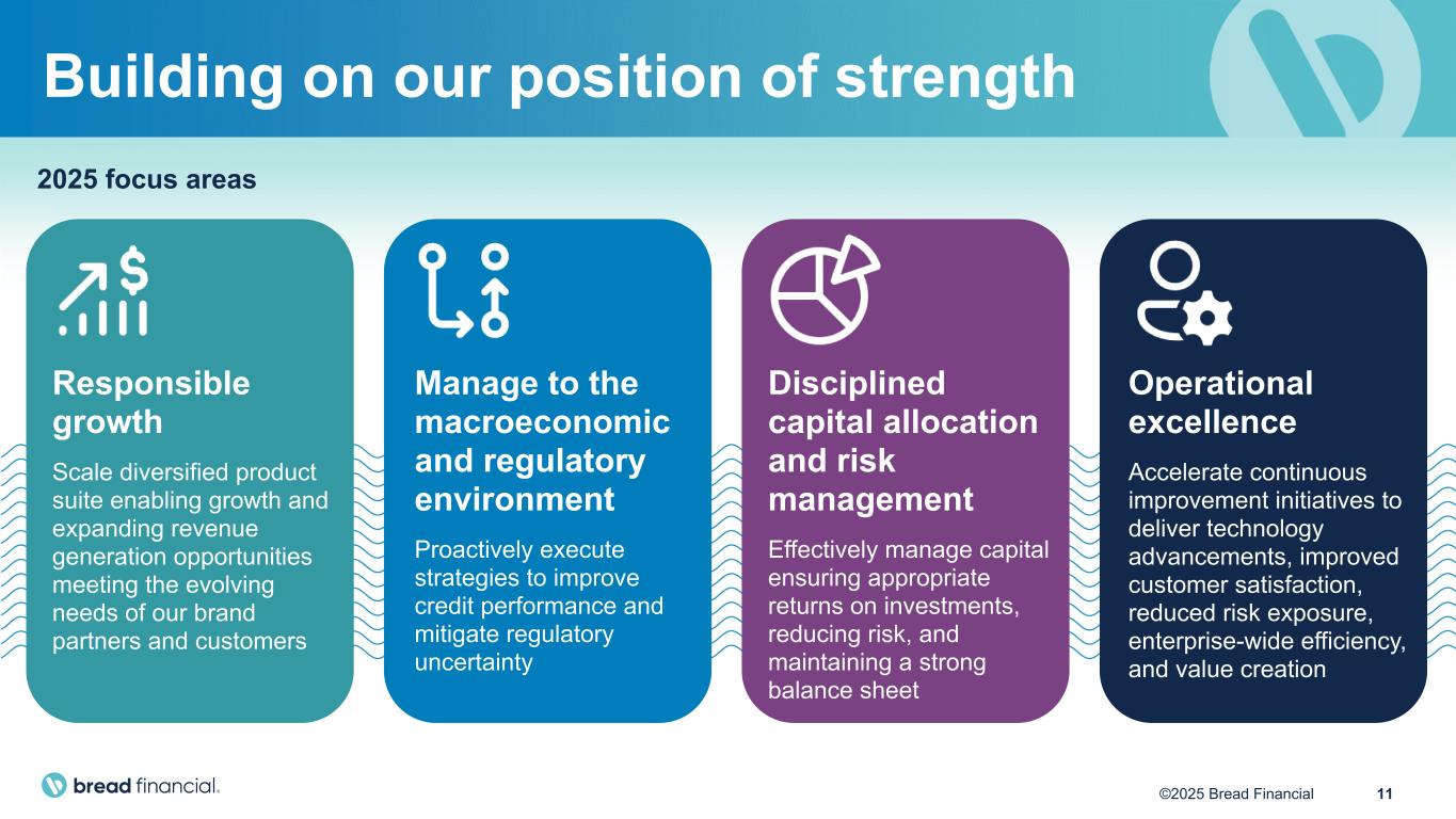 10©2025 Bread Financial 2025 financial outlook Our outlook assumes no impact from the CFPB late fee rule given uncertainty surrounding the timing and outcome of ongoing litigation.(1) Full year 2024 actuals Full year 2025 outlook Commentary Average loans 2024: $18,084 million Flat • Based on our current economic outlook, strategic credit tightening actions, anticipated elevated gross credit losses, and visibility into our pipeline and existing partners, we expect 2025 average credit card and other loans to be flat with the 2024 balance. • We expect year-end 2025 loans to be higher than year-end 2024 as a result of new business growth and higher credit sales in the year. Revenue (excl. gain on sale)(2) 2024: $3,827 million Up low single digits • Net interest margin is expected to be modestly higher than the 2024 full year rate as a result of mitigation actions taken in response to the CFPB late fee rule, partially offset by interest rate reductions by the Federal Reserve and our continued shift in risk and product mix. • Revenue guidance excludes portfolio sale gains. Adjusted total non-interest expenses(2) 2024: $1,953 million Positive operating leverage • Expect to deliver full year positive operating leverage, excluding any portfolio sale gains and the $107 million pre-tax impact in 2024 from our repurchased convertible notes. • We continue to strategically invest in technology modernization, marketing, and product innovation to drive growth and efficiencies. Net loss rate 2024: 8.2% 8.0% to 8.2% • 2025 net loss rate is expected to improve from 2024 as a result of our credit management actions and responsible loan growth, yet remain elevated due to continued inflationary pressure on consumers’ ability to pay. (1) A preliminary injunction has been granted in the lawsuit challenging the CFPB's final late fee rule. We cannot provide any assurance regarding the outcome of this or any other litigation relating to the rule. See "Forward-Looking Statements" included elsewhere in this presentation. (2) Revenue (excl. gain on sale) and Adjusted total non-interest expenses are Non-GAAP Financial Measures. We believe these forward-looking, Non-GAAP financial measures may be a useful tool for the investment community in evaluating the ongoing operations of our company. We are unable to provide a quantitative reconciliation of the forward-looking 2025 financial outlook for these Non-GAAP Financial Measures to their most directly comparable forward-looking GAAP measures as we cannot reliably predict all of the necessary components of such forward-looking GAAP measures without unreasonable effort.
