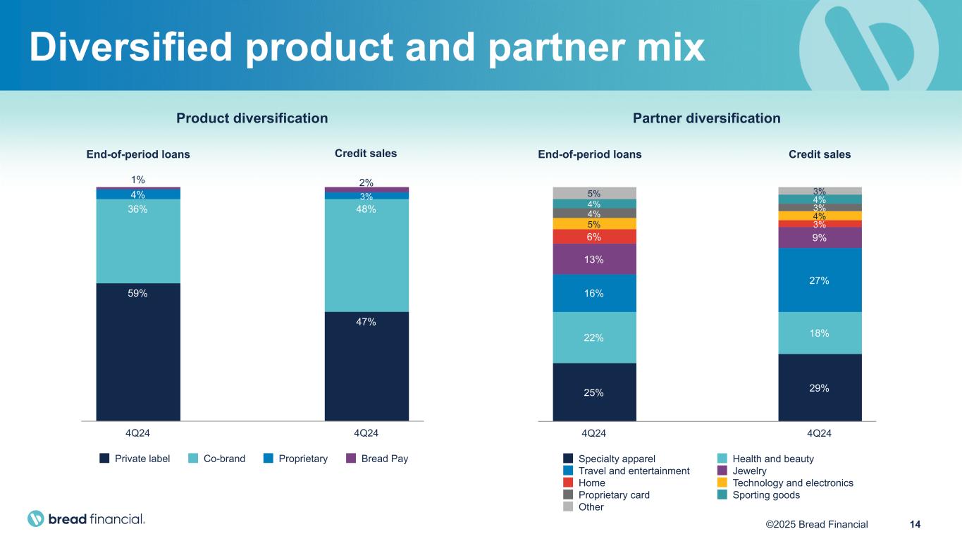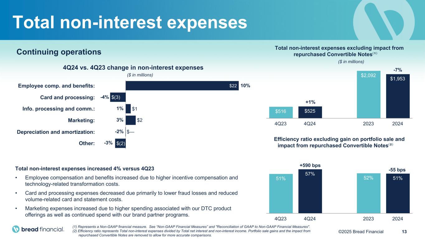 13©2025 Bread Financial Continuing operations Total non-interest expenses increased 4% versus 4Q23 • Employee compensation and benefits increased due to higher incentive compensation and technology-related transformation costs. • Card and processing expenses decreased due primarily to lower fraud losses and reduced volume-related card and statement costs. • Marketing expenses increased due to higher spending associated with our DTC product offerings as well as continued spend with our brand partner programs. Efficiency ratio excluding gain on portfolio sale and impact from repurchased Convertible Notes⁽²⁾ 51% 57% 52% 51% 4Q23 4Q24 2023 2024 Total non-interest expenses excluding impact from repurchased Convertible Notes⁽¹⁾ $516 $525 $2,092 $1,953 4Q23 4Q24 2023 2024 Total non-interest expenses $22 $(3) $1 $2 $— $(2) Employee comp. and benefits: Card and processing: Info. processing and comm.: Marketing: Depreciation and amortization: Other: 10% -4% 1% 3% -2% -3% 4Q24 vs. 4Q23 change in non-interest expenses (1) Represents a Non-GAAP financial measure. See “Non-GAAP Financial Measures” and "Reconciliation of GAAP to Non-GAAP Financial Measures". (2) Efficiency ratio represents Total non-interest expenses divided by Total net interest and non-interest income. Portfolio sale gains and the impact from repurchased Convertible Notes are removed to allow for more accurate comparisons. ($ in millions) +1% +590 bps ($ in millions) -7% -55 bps