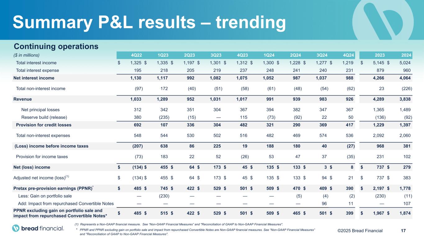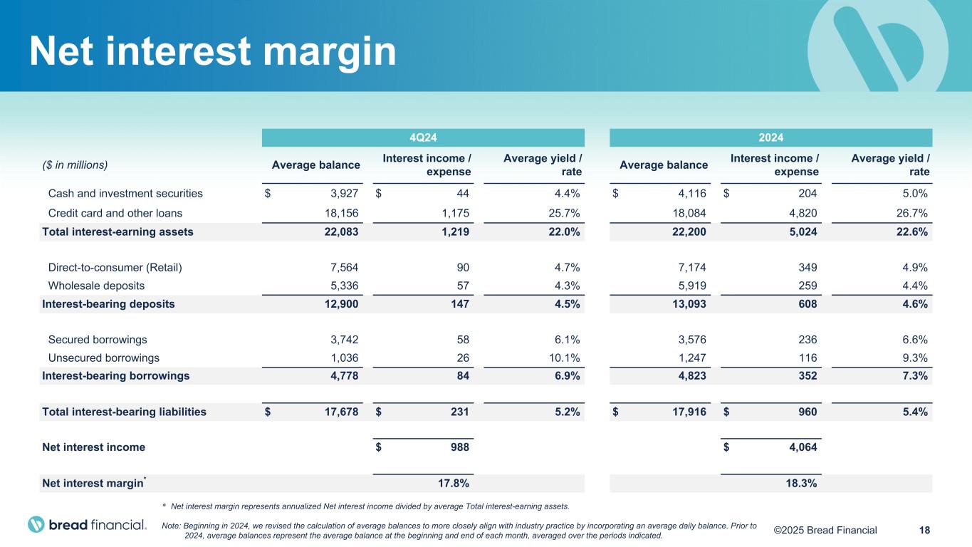17©2025 Bread Financial Continuing operations ($ in millions) 4Q22 1Q23 2Q23 3Q23 4Q23 1Q24 2Q24 3Q24 4Q24 2023 2024 Total interest income $ 1,325 $ 1,335 $ 1,197 $ 1,301 $ 1,312 $ 1,300 $ 1,228 $ 1,277 $ 1,219 $ 5,145 $ 5,024 Total interest expense 195 218 205 219 237 248 241 240 231 879 960 Net interest income 1,130 1,117 992 1,082 1,075 1,052 987 1,037 988 4,266 4,064 Total non-interest income (97) 172 (40) (51) (58) (61) (48) (54) (62) 23 (226) Revenue 1,033 1,289 952 1,031 1,017 991 939 983 926 4,289 3,838 Net principal losses 312 342 351 304 367 394 382 347 367 1,365 1,489 Reserve build (release) 380 (235) (15) — 115 (73) (92) 22 50 (136) (92) Provision for credit losses 692 107 336 304 482 321 290 369 417 1,229 1,397 Total non-interest expenses 548 544 530 502 516 482 469 574 536 2,092 2,060 (Loss) income before income taxes (207) 638 86 225 19 188 180 40 (27) 968 381 Provision for income taxes (73) 183 22 52 (26) 53 47 37 (35) 231 102 Net (loss) income $ (134) $ 455 $ 64 $ 173 $ 45 $ 135 $ 133 $ 3 $ 8 $ 737 $ 279 Adjusted net income (loss)(1) $ (134) $ 455 $ 64 $ 173 $ 45 $ 135 $ 133 $ 94 $ 21 $ 737 $ 383 Pretax pre-provision earnings (PPNR)* $ 485 $ 745 $ 422 $ 529 $ 501 $ 509 $ 470 $ 409 $ 390 $ 2,197 $ 1,778 Less: Gain on portfolio sale — (230) — — — — (5) (4) (2) (230) (11) Add: Impact from repurchased Convertible Notes — — — — — — — 96 11 — 107 PPNR excluding gain on portfolio sale and impact from repurchased Convertible Notes* $ 485 $ 515 $ 422 $ 529 $ 501 $ 509 $ 465 $ 501 $ 399 $ 1,967 $ 1,874 Summary P&L results – trending * PPNR and PPNR excluding gain on portfolio sale and impact from repurchased Convertible Notes are Non-GAAP financial measures. See “Non-GAAP Financial Measures” and "Reconciliation of GAAP to Non-GAAP Financial Measures". (1) Represents a Non-GAAP financial measure. See “Non-GAAP Financial Measures” and "Reconciliation of GAAP to Non-GAAP Financial Measures".