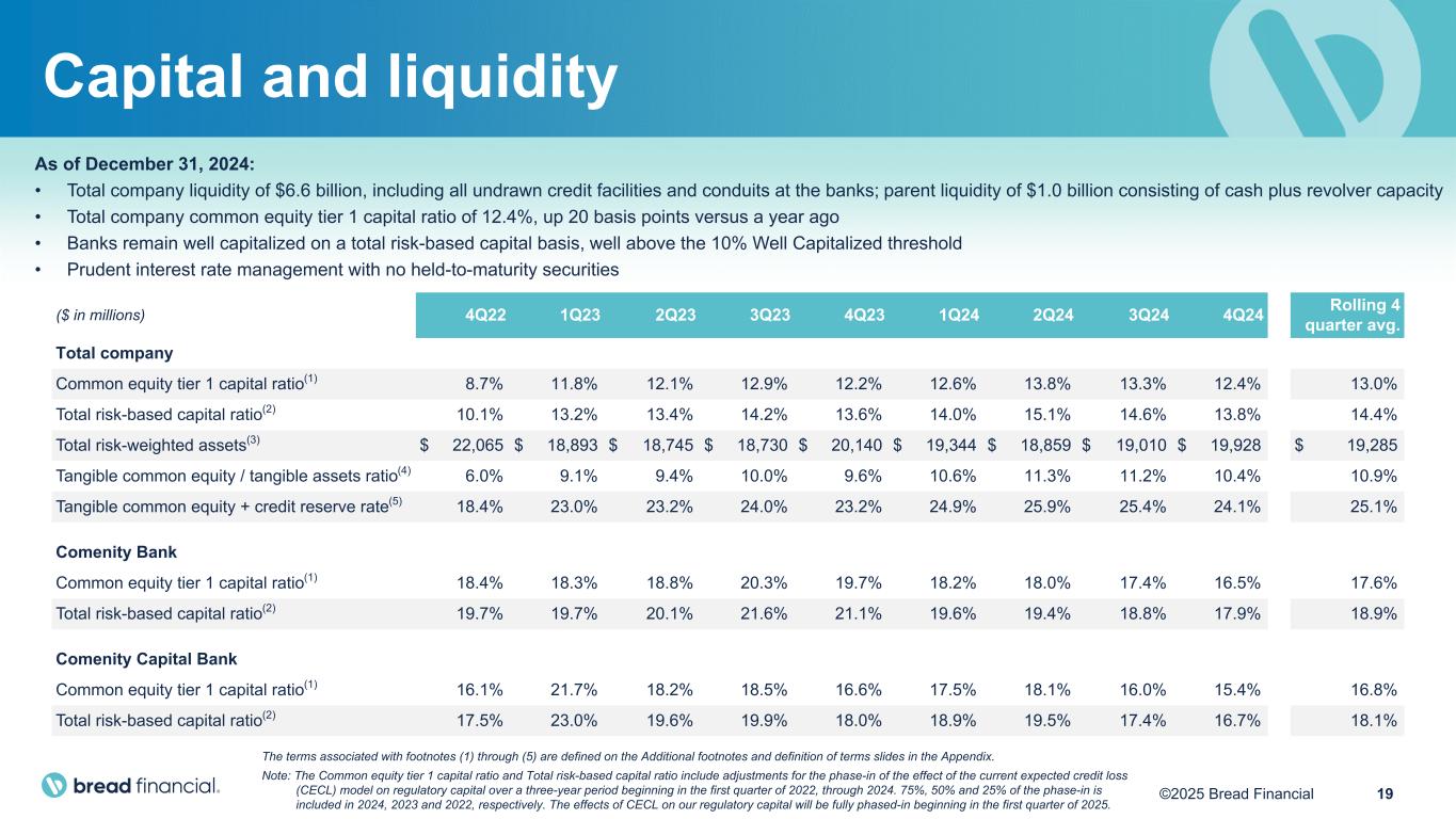 18©2025 Bread Financial 4Q24 2024 ($ in millions) Average balance Interest income / expense Average yield / rate Average balance Interest income / expense Average yield / rate Cash and investment securities $ 3,927 $ 44 4.4% $ 4,116 $ 204 5.0% Credit card and other loans 18,156 1,175 25.7% 18,084 4,820 26.7% Total interest-earning assets 22,083 1,219 22.0% 22,200 5,024 22.6% Direct-to-consumer (Retail) 7,564 90 4.7% 7,174 349 4.9% Wholesale deposits 5,336 57 4.3% 5,919 259 4.4% Interest-bearing deposits 12,900 147 4.5% 13,093 608 4.6% Secured borrowings 3,742 58 6.1% 3,576 236 6.6% Unsecured borrowings 1,036 26 10.1% 1,247 116 9.3% Interest-bearing borrowings 4,778 84 6.9% 4,823 352 7.3% Total interest-bearing liabilities $ 17,678 $ 231 5.2% $ 17,916 $ 960 5.4% Net interest income $ 988 $ 4,064 Net interest margin* 17.8% 18.3% * Net interest margin represents annualized Net interest income divided by average Total interest-earning assets. Note: Beginning in 2024, we revised the calculation of average balances to more closely align with industry practice by incorporating an average daily balance. Prior to 2024, average balances represent the average balance at the beginning and end of each month, averaged over the periods indicated. Net interest margin