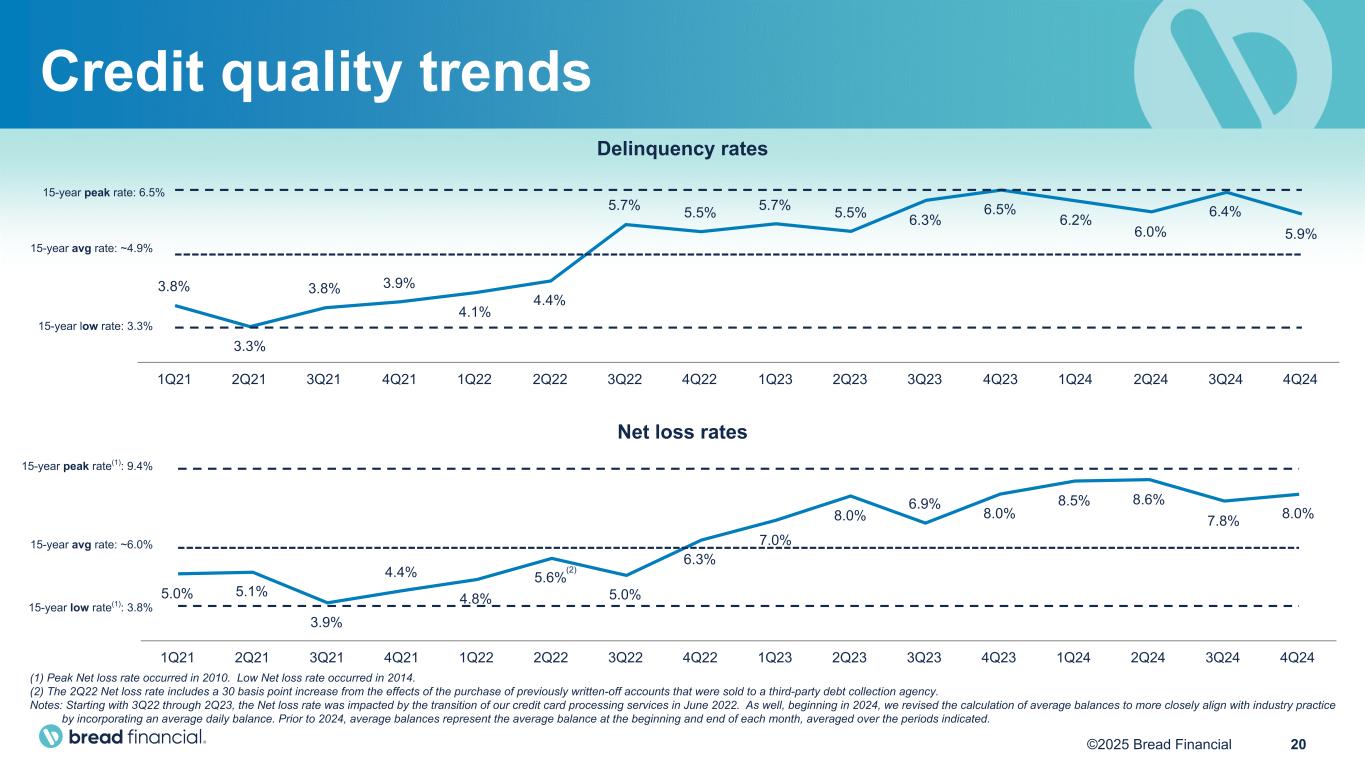 19©2025 Bread Financial ($ in millions) 4Q22 1Q23 2Q23 3Q23 4Q23 1Q24 2Q24 3Q24 4Q24 Rolling 4 quarter avg. Total company Common equity tier 1 capital ratio(1) 8.7% 11.8% 12.1% 12.9% 12.2% 12.6% 13.8% 13.3% 12.4% 13.0% Total risk-based capital ratio(2) 10.1% 13.2% 13.4% 14.2% 13.6% 14.0% 15.1% 14.6% 13.8% 14.4% Total risk-weighted assets(3) $ 22,065 $ 18,893 $ 18,745 $ 18,730 $ 20,140 $ 19,344 $ 18,859 $ 19,010 $ 19,928 $ 19,285 Tangible common equity / tangible assets ratio(4) 6.0% 9.1% 9.4% 10.0% 9.6% 10.6% 11.3% 11.2% 10.4% 10.9% Tangible common equity + credit reserve rate(5) 18.4% 23.0% 23.2% 24.0% 23.2% 24.9% 25.9% 25.4% 24.1% 25.1% Comenity Bank Common equity tier 1 capital ratio(1) 18.4% 18.3% 18.8% 20.3% 19.7% 18.2% 18.0% 17.4% 16.5% 17.6% Total risk-based capital ratio(2) 19.7% 19.7% 20.1% 21.6% 21.1% 19.6% 19.4% 18.8% 17.9% 18.9% Comenity Capital Bank Common equity tier 1 capital ratio(1) 16.1% 21.7% 18.2% 18.5% 16.6% 17.5% 18.1% 16.0% 15.4% 16.8% Total risk-based capital ratio(2) 17.5% 23.0% 19.6% 19.9% 18.0% 18.9% 19.5% 17.4% 16.7% 18.1% As of December 31, 2024: • Total company liquidity of $6.6 billion, including all undrawn credit facilities and conduits at the banks; parent liquidity of $1.0 billion consisting of cash plus revolver capacity • Total company common equity tier 1 capital ratio of 12.4%, up 20 basis points versus a year ago • Banks remain well capitalized on a total risk-based capital basis, well above the 10% Well Capitalized threshold • Prudent interest rate management with no held-to-maturity securities Capital and liquidity The terms associated with footnotes (1) through (5) are defined on the Additional footnotes and definition of terms slides in the Appendix. Note: The Common equity tier 1 capital ratio and Total risk-based capital ratio include adjustments for the phase-in of the effect of the current expected credit loss (CECL) model on regulatory capital over a three-year period beginning in the first quarter of 2022, through 2024. 75%, 50% and 25% of the phase-in is included in 2024, 2023 and 2022, respectively. The effects of CECL on our regulatory capital will be fully phased-in beginning in the first quarter of 2025.
