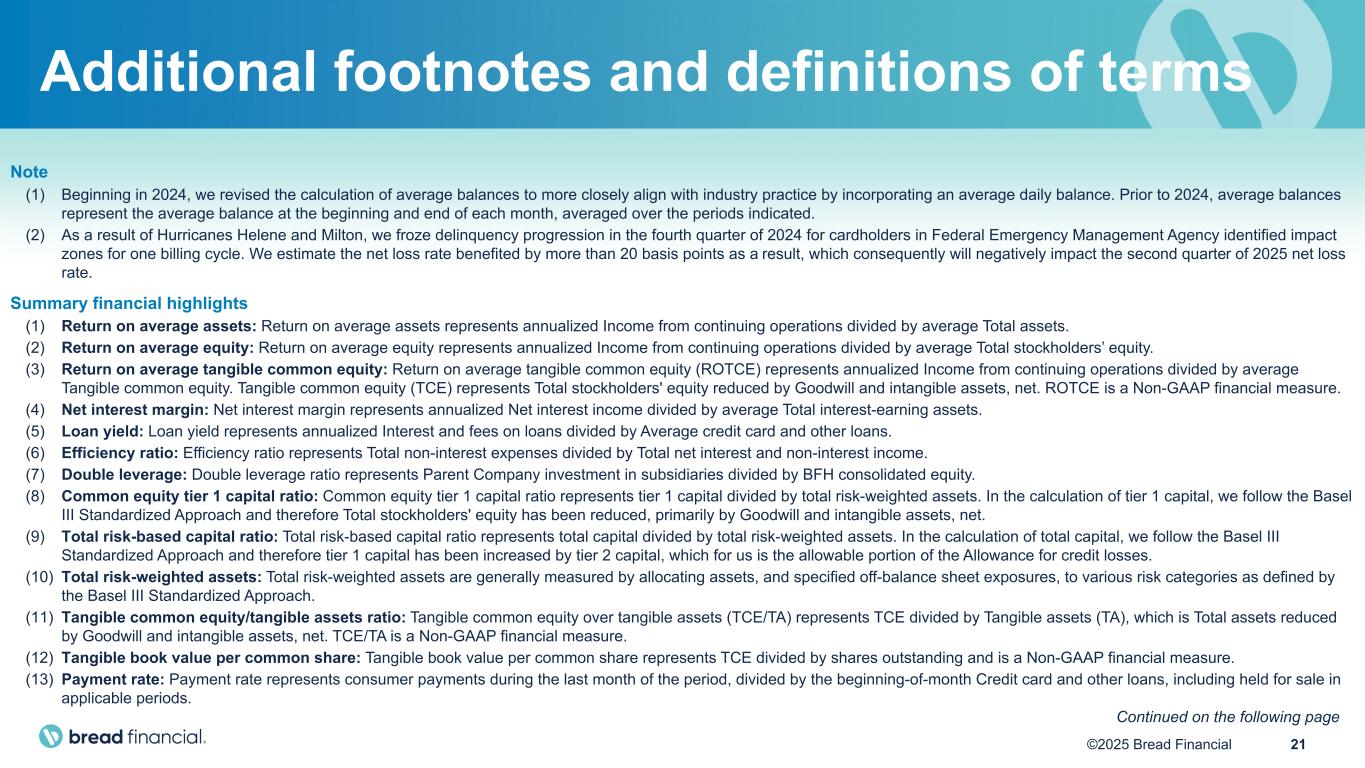 20©2025 Bread Financial 5.0% 5.1% 3.9% 4.4% 4.8% 5.6% 5.0% 6.3% 7.0% 8.0% 6.9% 8.0% 8.5% 8.6% 7.8% 8.0% 1Q21 2Q21 3Q21 4Q21 1Q22 2Q22 3Q22 4Q22 1Q23 2Q23 3Q23 4Q23 1Q24 2Q24 3Q24 4Q24 3.8% 3.3% 3.8% 3.9% 4.1% 4.4% 5.7% 5.5% 5.7% 5.5% 6.3% 6.5% 6.2% 6.0% 6.4% 5.9% 1Q21 2Q21 3Q21 4Q21 1Q22 2Q22 3Q22 4Q22 1Q23 2Q23 3Q23 4Q23 1Q24 2Q24 3Q24 4Q24 15-year low rate(1): 3.8% 15-year avg rate: ~6.0% 15-year avg rate: ~4.9% 15-year low rate: 3.3% Credit quality trends (2) Delinquency rates Net loss rates 15-year peak rate(1): 9.4% 15-year peak rate: 6.5% (1) Peak Net loss rate occurred in 2010. Low Net loss rate occurred in 2014. (2) The 2Q22 Net loss rate includes a 30 basis point increase from the effects of the purchase of previously written-off accounts that were sold to a third-party debt collection agency. Notes: Starting with 3Q22 through 2Q23, the Net loss rate was impacted by the transition of our credit card processing services in June 2022. As well, beginning in 2024, we revised the calculation of average balances to more closely align with industry practice by incorporating an average daily balance. Prior to 2024, average balances represent the average balance at the beginning and end of each month, averaged over the periods indicated.