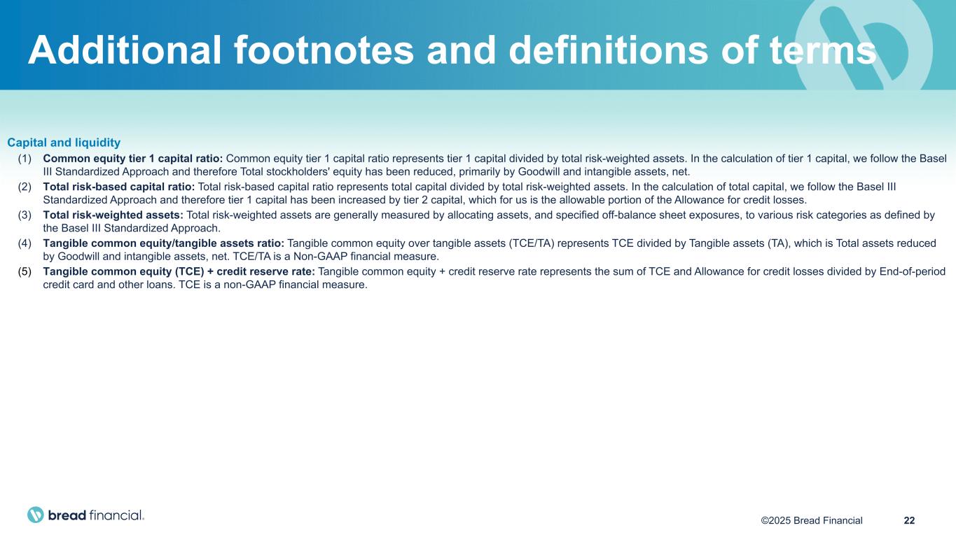 21©2025 Bread Financial Additional footnotes and definitions of terms Note (1) Beginning in 2024, we revised the calculation of average balances to more closely align with industry practice by incorporating an average daily balance. Prior to 2024, average balances represent the average balance at the beginning and end of each month, averaged over the periods indicated. (2) As a result of Hurricanes Helene and Milton, we froze delinquency progression in the fourth quarter of 2024 for cardholders in Federal Emergency Management Agency identified impact zones for one billing cycle. We estimate the net loss rate benefited by more than 20 basis points as a result, which consequently will negatively impact the second quarter of 2025 net loss rate. Summary financial highlights (1) Return on average assets: Return on average assets represents annualized Income from continuing operations divided by average Total assets. (2) Return on average equity: Return on average equity represents annualized Income from continuing operations divided by average Total stockholders’ equity. (3) Return on average tangible common equity: Return on average tangible common equity (ROTCE) represents annualized Income from continuing operations divided by average Tangible common equity. Tangible common equity (TCE) represents Total stockholders' equity reduced by Goodwill and intangible assets, net. ROTCE is a Non-GAAP financial measure. (4) Net interest margin: Net interest margin represents annualized Net interest income divided by average Total interest-earning assets. (5) Loan yield: Loan yield represents annualized Interest and fees on loans divided by Average credit card and other loans. (6) Efficiency ratio: Efficiency ratio represents Total non-interest expenses divided by Total net interest and non-interest income. (7) Double leverage: Double leverage ratio represents Parent Company investment in subsidiaries divided by BFH consolidated equity. (8) Common equity tier 1 capital ratio: Common equity tier 1 capital ratio represents tier 1 capital divided by total risk-weighted assets. In the calculation of tier 1 capital, we follow the Basel III Standardized Approach and therefore Total stockholders' equity has been reduced, primarily by Goodwill and intangible assets, net. (9) Total risk-based capital ratio: Total risk-based capital ratio represents total capital divided by total risk-weighted assets. In the calculation of total capital, we follow the Basel III Standardized Approach and therefore tier 1 capital has been increased by tier 2 capital, which for us is the allowable portion of the Allowance for credit losses. (10) Total risk-weighted assets: Total risk-weighted assets are generally measured by allocating assets, and specified off-balance sheet exposures, to various risk categories as defined by the Basel III Standardized Approach. (11) Tangible common equity/tangible assets ratio: Tangible common equity over tangible assets (TCE/TA) represents TCE divided by Tangible assets (TA), which is Total assets reduced by Goodwill and intangible assets, net. TCE/TA is a Non-GAAP financial measure. (12) Tangible book value per common share: Tangible book value per common share represents TCE divided by shares outstanding and is a Non-GAAP financial measure. (13) Payment rate: Payment rate represents consumer payments during the last month of the period, divided by the beginning-of-month Credit card and other loans, including held for sale in applicable periods. Continued on the following page