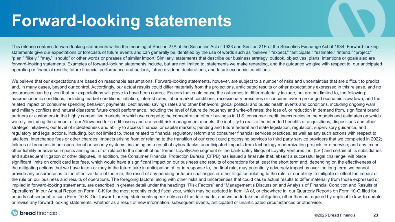 22©2025 Bread Financial Additional footnotes and definitions of terms Capital and liquidity (1) Common equity tier 1 capital ratio: Common equity tier 1 capital ratio represents tier 1 capital divided by total risk-weighted assets. In the calculation of tier 1 capital, we follow the Basel III Standardized Approach and therefore Total stockholders' equity has been reduced, primarily by Goodwill and intangible assets, net. (2) Total risk-based capital ratio: Total risk-based capital ratio represents total capital divided by total risk-weighted assets. In the calculation of total capital, we follow the Basel III Standardized Approach and therefore tier 1 capital has been increased by tier 2 capital, which for us is the allowable portion of the Allowance for credit losses. (3) Total risk-weighted assets: Total risk-weighted assets are generally measured by allocating assets, and specified off-balance sheet exposures, to various risk categories as defined by the Basel III Standardized Approach. (4) Tangible common equity/tangible assets ratio: Tangible common equity over tangible assets (TCE/TA) represents TCE divided by Tangible assets (TA), which is Total assets reduced by Goodwill and intangible assets, net. TCE/TA is a Non-GAAP financial measure. (5) Tangible common equity (TCE) + credit reserve rate: Tangible common equity + credit reserve rate represents the sum of TCE and Allowance for credit losses divided by End-of-period credit card and other loans. TCE is a non-GAAP financial measure.